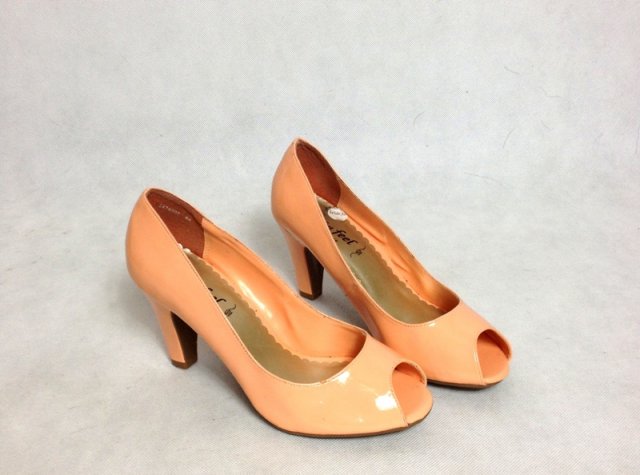 Lakierowane łososiowe buciki marki Nev Look bez palców na 9,5 obcasie.