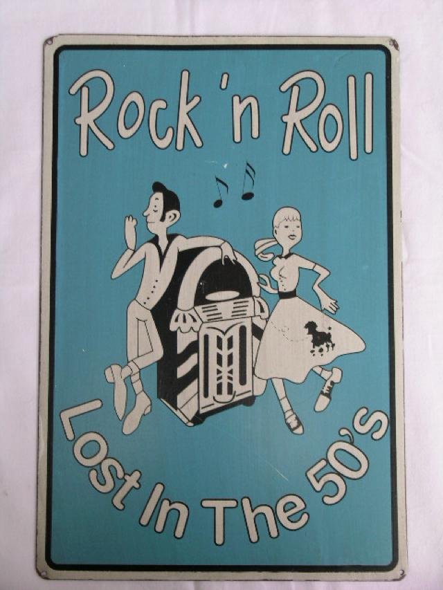 Duża,dekoracyjna tabliczka metalowa z rock-and-rollowym uśmiechem lat pięćdziesiątych. Satynowa powierzchnia. Dziurki w czterech rogach - do przybicia lub powieszenia. 30 x 20 cm. Postarzana. Stan zachowania dobry./drobna ryska na powierzchni.. - widoczna na foto /.