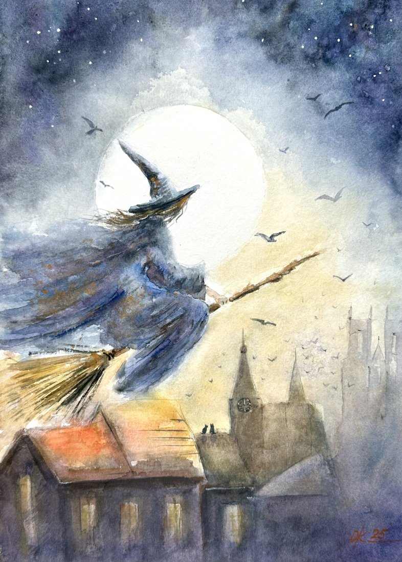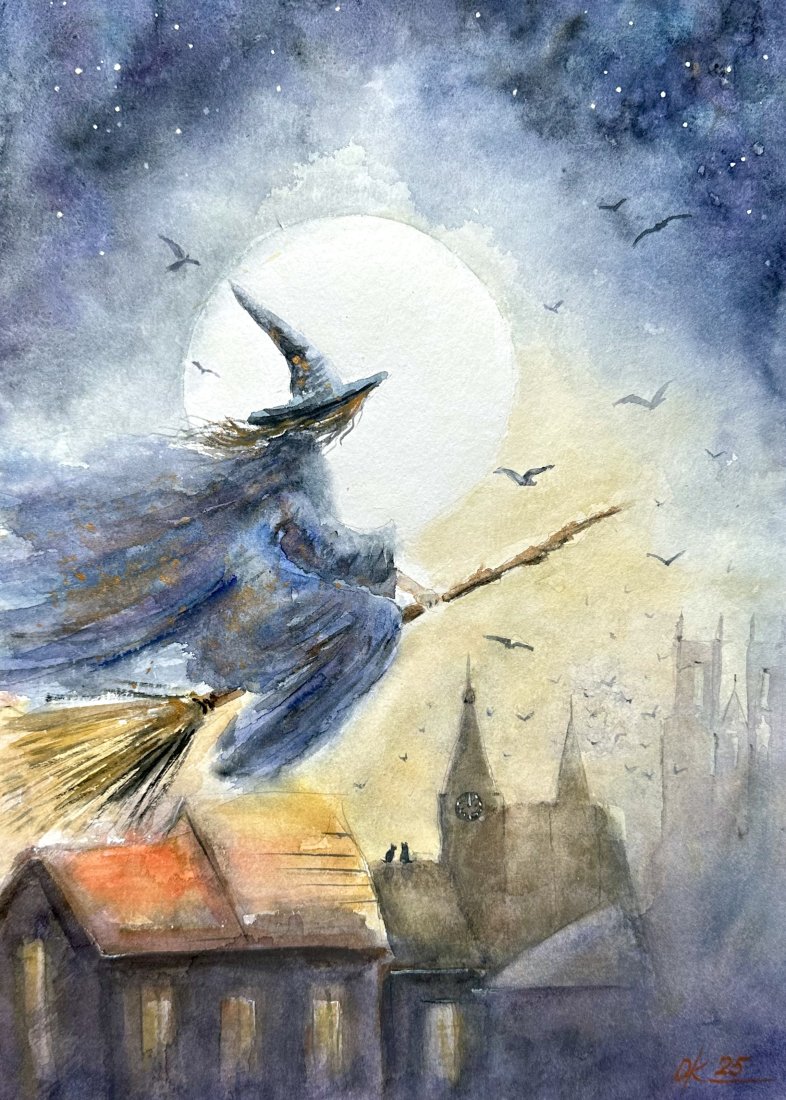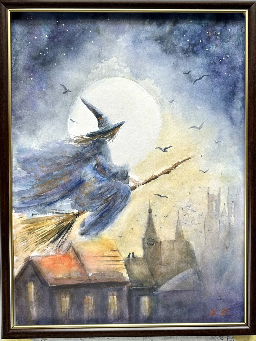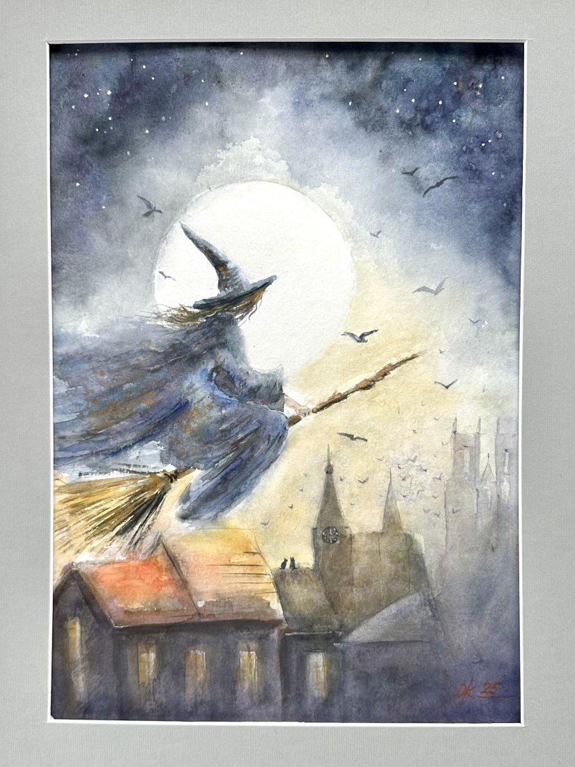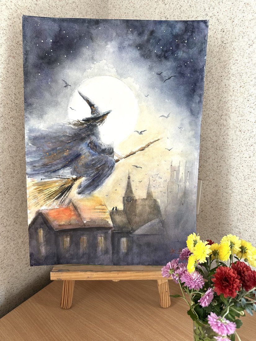 Lot czarownicy w księżycową noc. 30/42cm. Original Akwarela A3 ręcznie malowana.