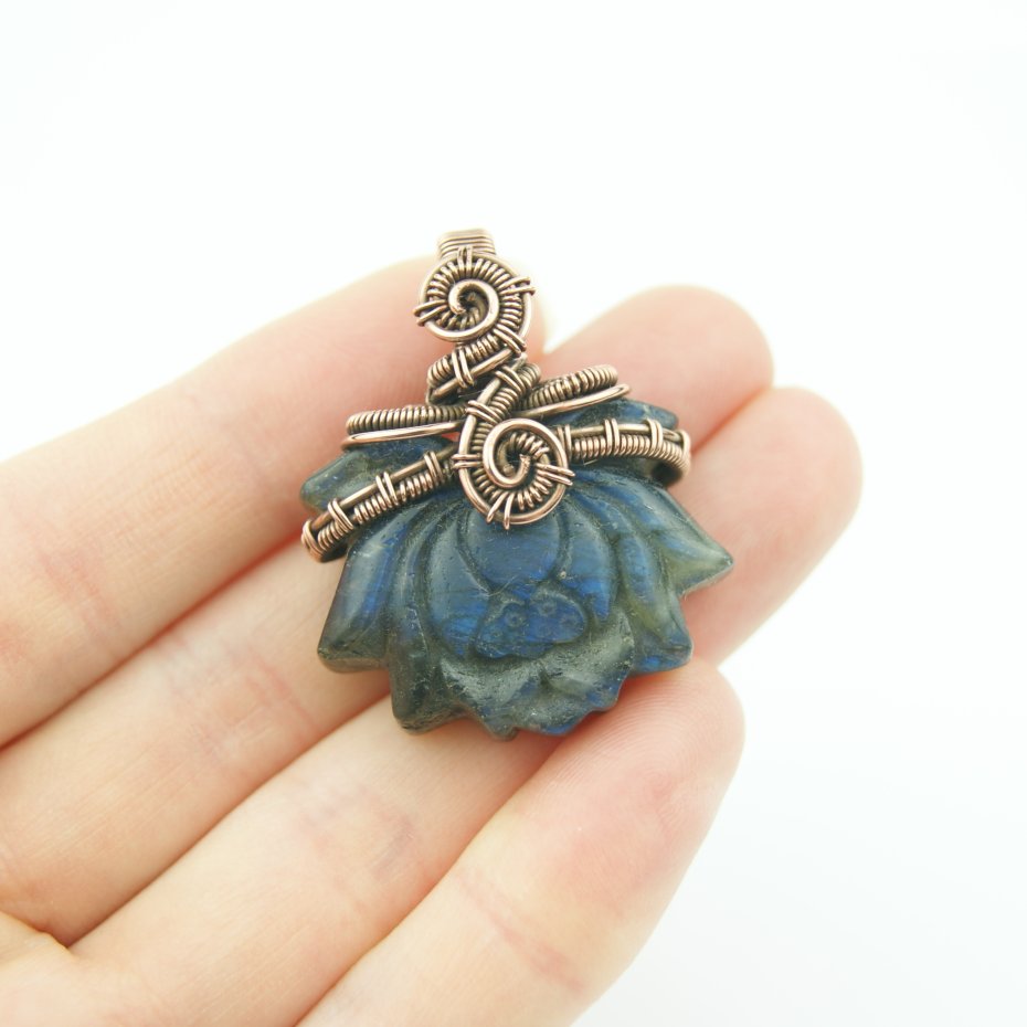 Wisiorek powstał z wyjątkowego kamienia jakim jest labradoryt, jego barwa zmienia się wraz z położeniem względem źródła światła.Kamień jest rzeźbiony w kształt kwiatu lotosu. Całość misternie opleciona miedzią.