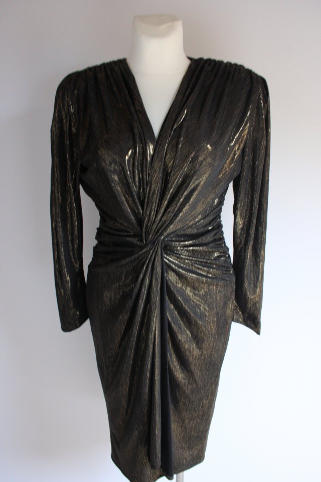 wieczorowa błyszcząca sukienka vintage z lat 80-tych, głęboki dekolt, liczne marszczenia, z tyłu w pasie zapinana na guzik, w ramionach poduszki