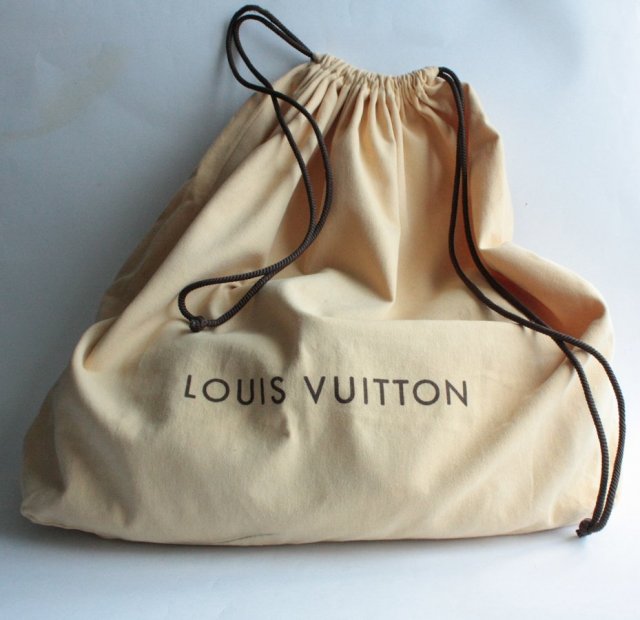 Duża torba w odcieniu ciepłego, jasnego beżu z nadrukiem Loius Vuitton. Można używać do przechowywania toreb i innych elementów garderoby, jak i do organizacji szafy. Materiał to prawdopodobnie bawełna.