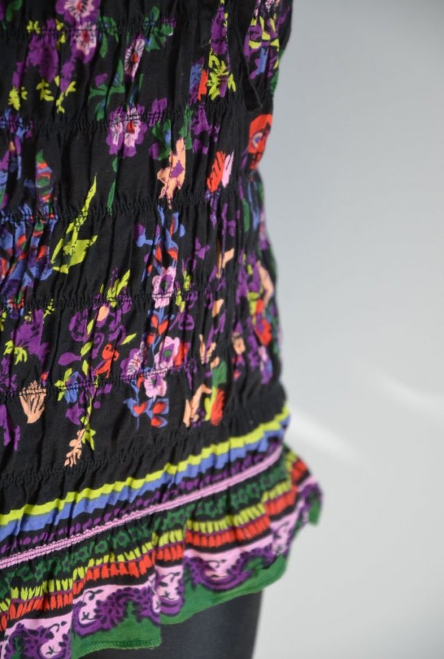 Urocza bluzeczka marki LOVE BY SOUL. Czarna w piękne kolorowe kwiaty. Dekolt na gumce, wiązany. Elastyczny, można nałożyć na ramiona. Rękawy krótkie zakończone lekką gumką z falbanką. Pod biustem odcinana, marszczeniem na gumeczkach. Wykończona na dole falbanką. Całość elastyczna.