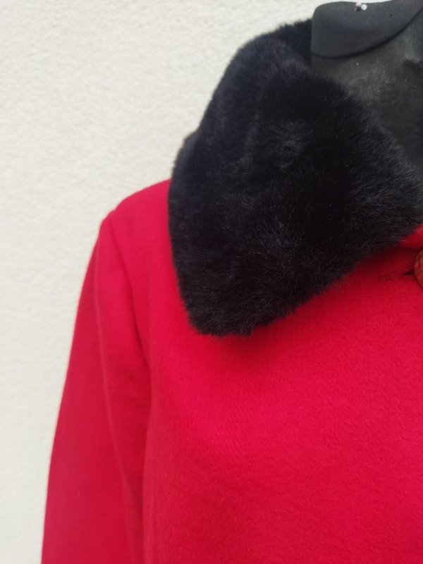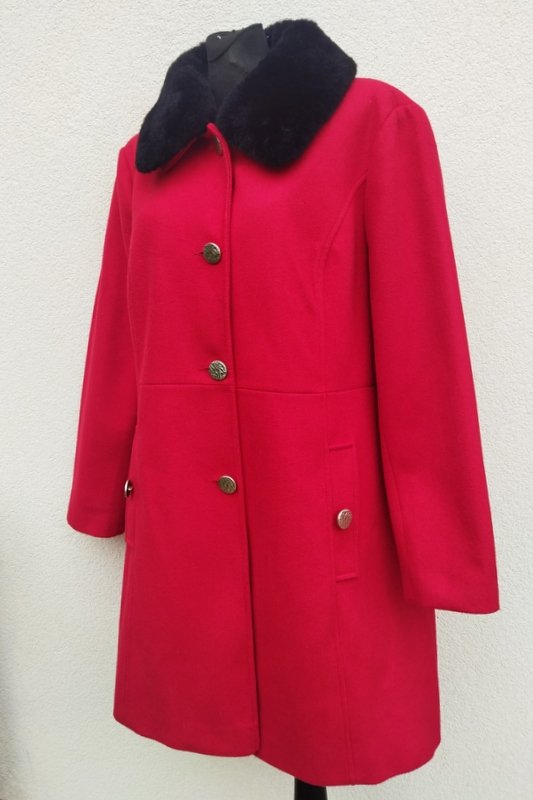 Ładny płaszcz z flauszowej tkaniny poliestrowej w kolorze nasyconej czerwieni. Lekko taliowany , odcinany w pasie, z kołnierzem i drugim dopinanym z czarnego futerka, z dwiema wpuszczanymi kieszeniami. zapinany na metalowe guziki w srebrnym kolorze. całość na podszewce.
