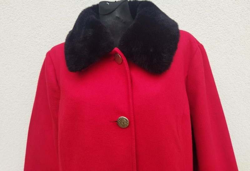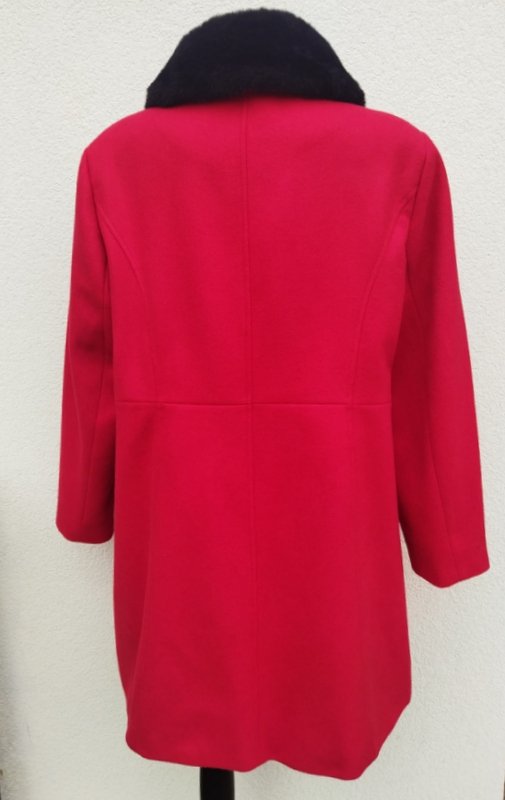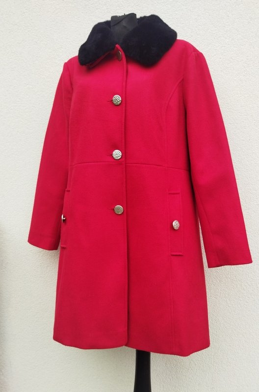 Ładny płaszcz z flauszowej tkaniny poliestrowej w kolorze nasyconej czerwieni. Lekko taliowany , odcinany w pasie, z kołnierzem i drugim dopinanym z czarnego futerka, z dwiema wpuszczanymi kieszeniami. zapinany na metalowe guziki w srebrnym kolorze. całość na podszewce.