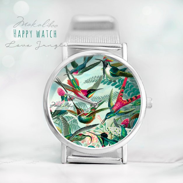 Niepowtarzalny, autorski zegarek z limitowanej kolekcji "Happy Watch". Koperta zegarka oraz zapięcie sygnowane jest naszym logiem Makaliboo. Wielkość tarczy zegarka 36 mm, szerokość paseczka 20 mm. Pasek to stalowa bransoletka zapinana na tradycyjną klamerkę. Pasuje na nadgarstek 14,5- 19 cm.