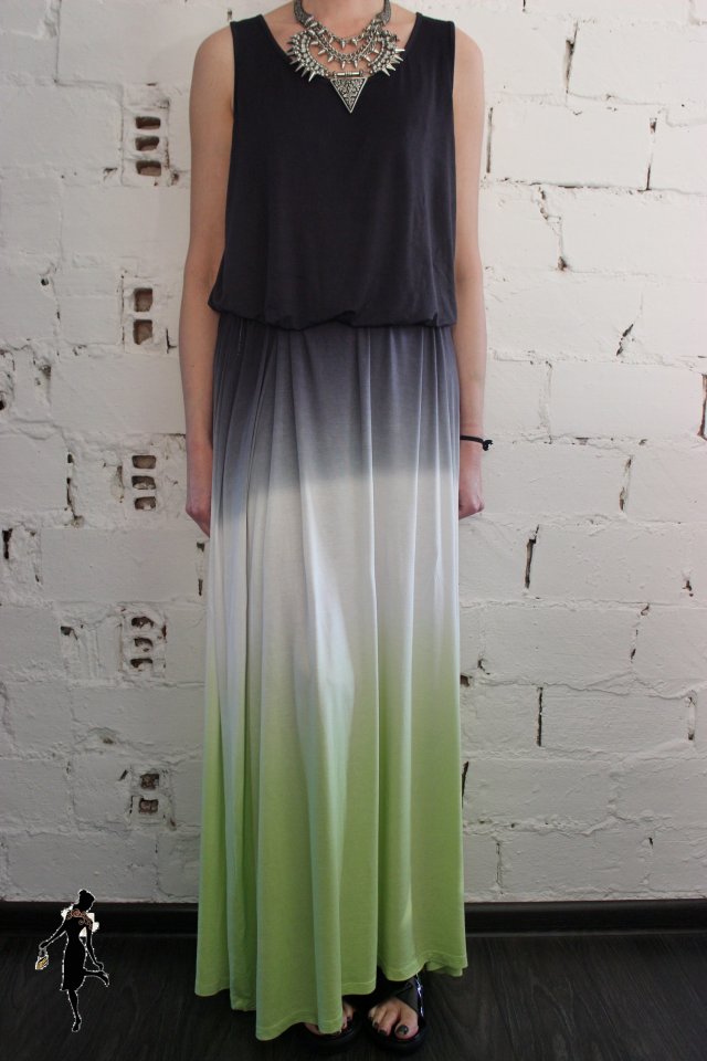Sukienka ombre. Firma Love Label. Rozmiar z metki 48/4XL. Wymiary: obwód biustu-60cmx2, obwód pasa-58cmx2, obwód bioder-80cmx2, długość sukienki-155cm. Skład materiału: 95% wiskoza, 5% elastan.