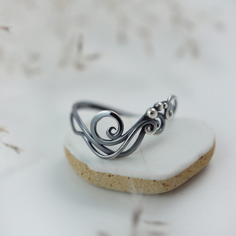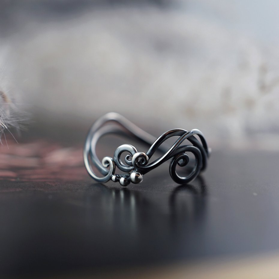 Pierścionek zaprojektowałam i wykonałam od podstaw, z wykorzystaniem techniki wire wrapping oraz klasycznych technik jubilerskich, ze srebra próby 925. Całość mocno oksydowana i polerowana.