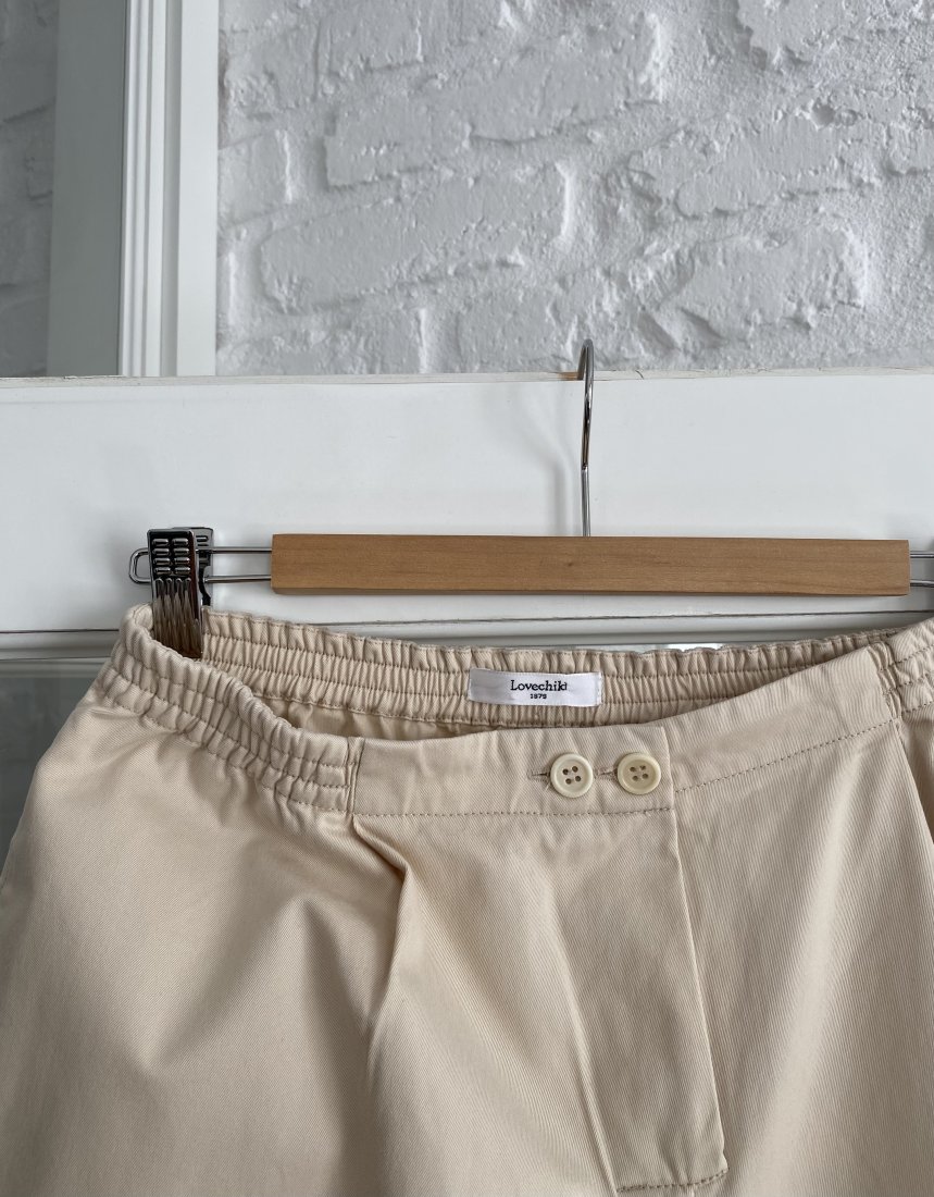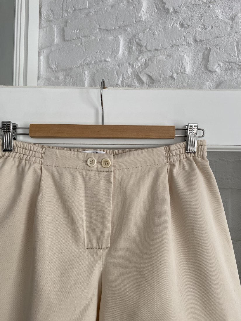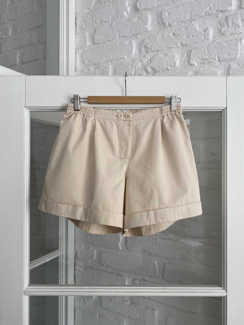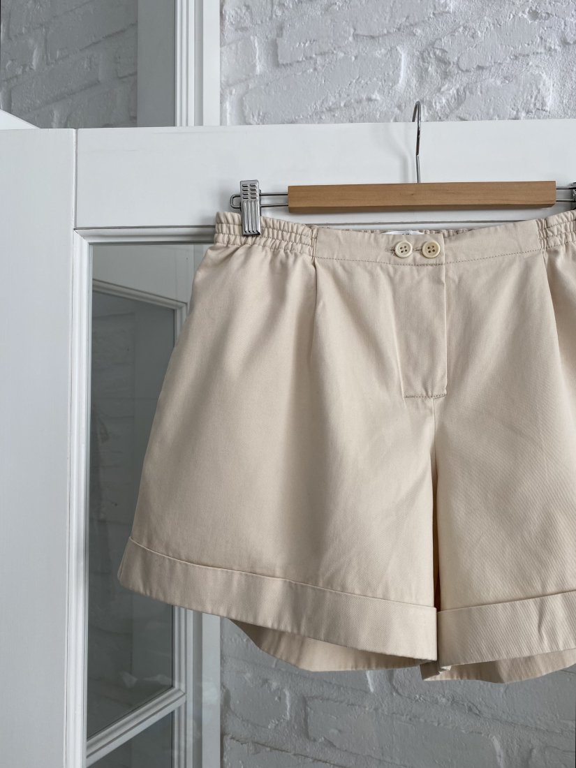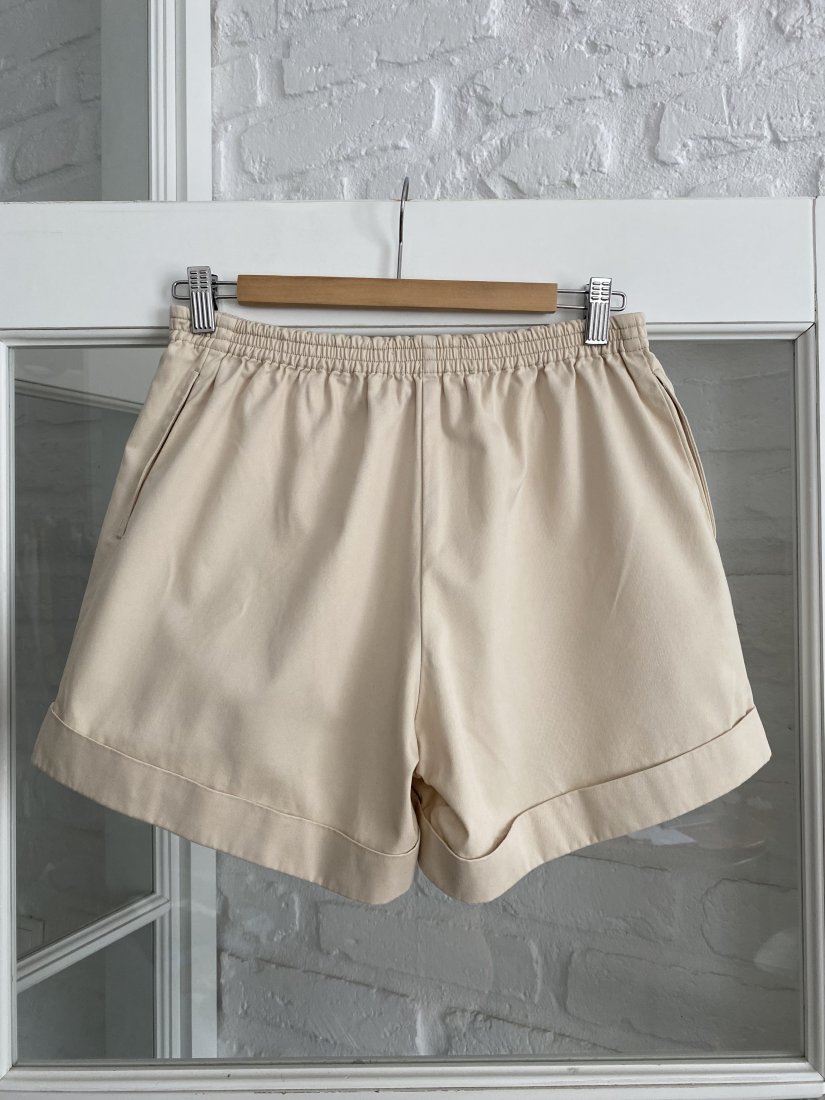 Beżowe szorty oversize z podwiniętą nogawką. Boczne kieszenie.