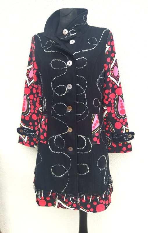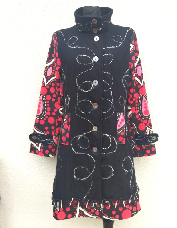 Urokliwy unikatowy płaszcz w stylu Desigual, z licznymi detalami i zdobieniami. Taliowany , z dwiema wpuszczanymi kieszeniami, zapinany na na guziki. Na podszewce