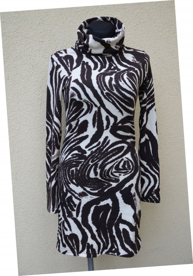 Dzianinowa sukienka marki LUC*CE. Prosty krój z drapieżnym wzorem sprawia iż jest bardzo stylowa. Wywijany luźny golf. Długie rękawy. Materiał elastyczny, miły w dotyku. Kolor brąz z ecru.