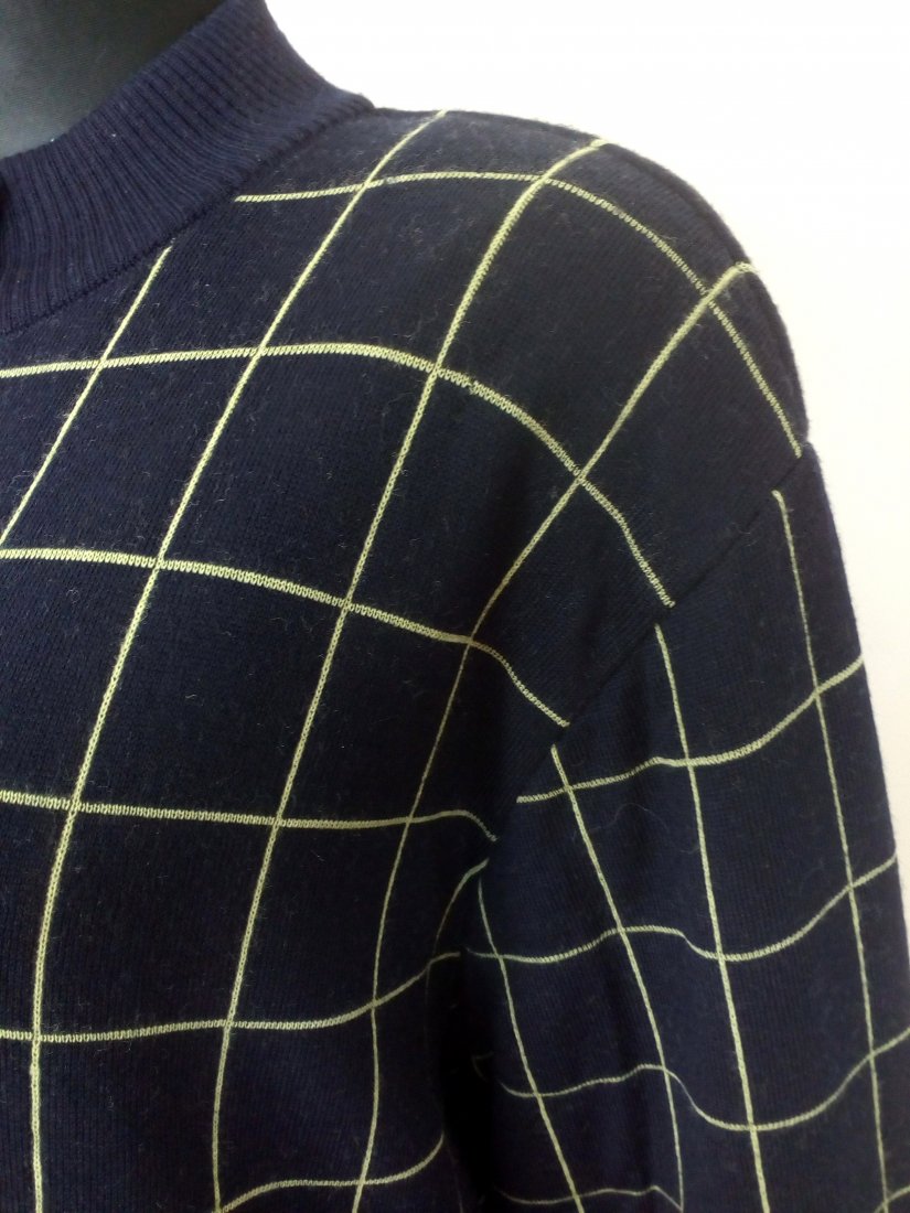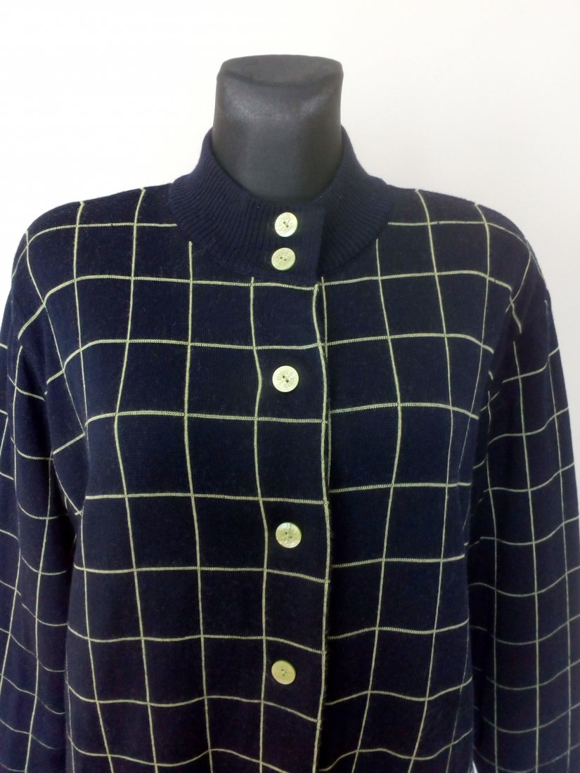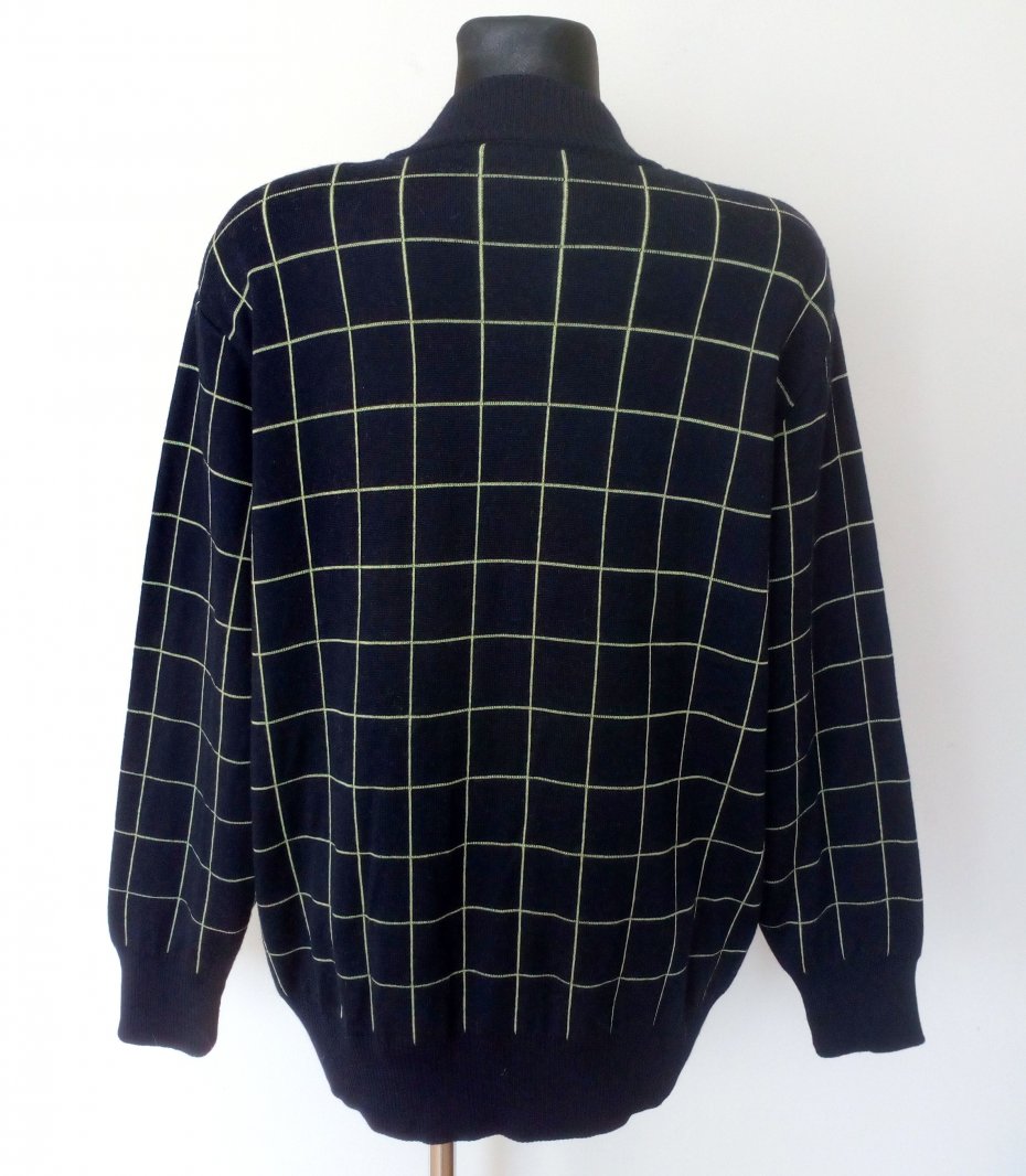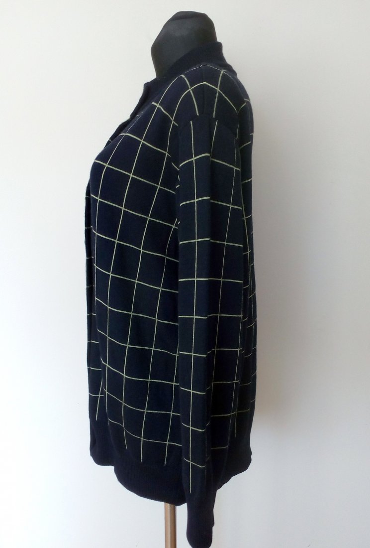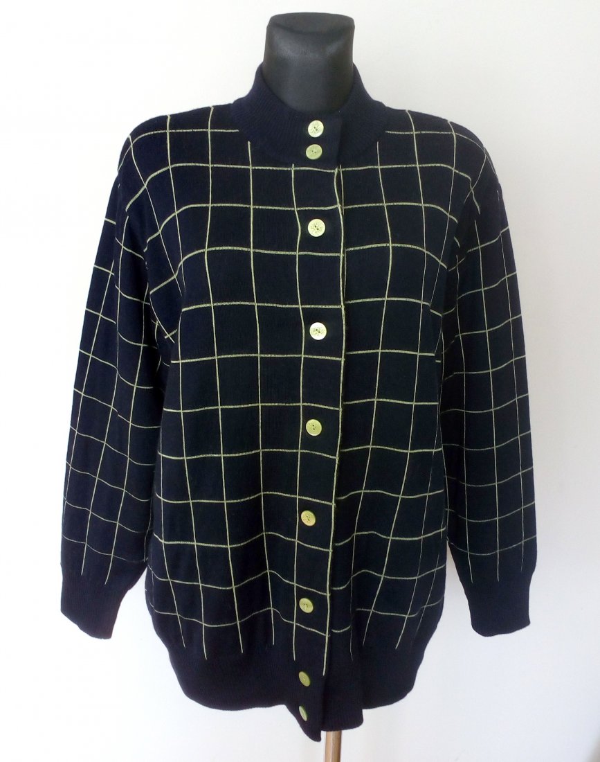 Ciemnogranatowy kardigan w limonkową kratę, zapinany na guziki w kolorze kratki - zapasowy guzik od środka, wokół szyi stójka, u dołu i przy rękawach wyższy ściągacz, na ramionach poduszki, dzianina porządnej jakości