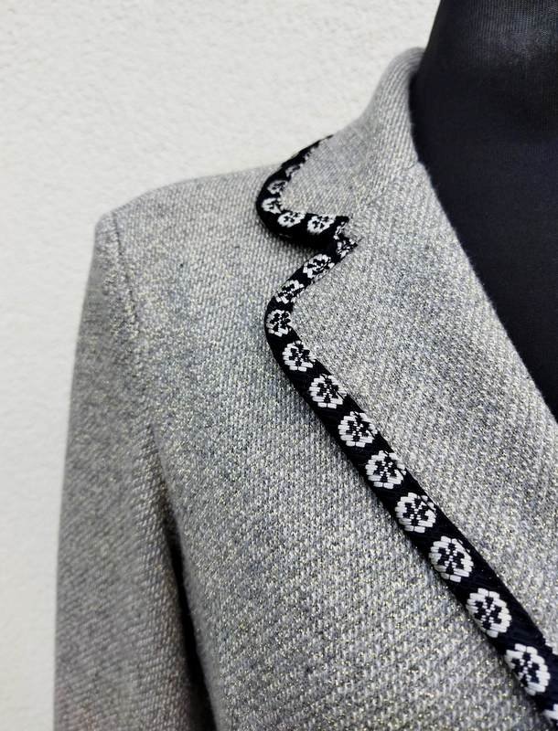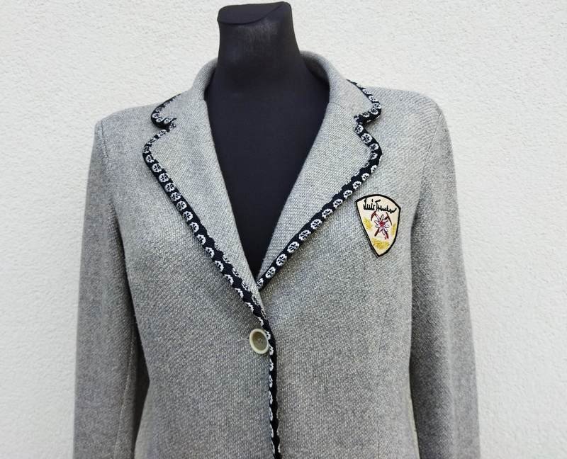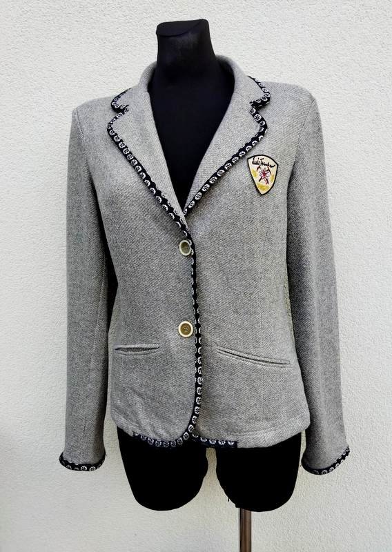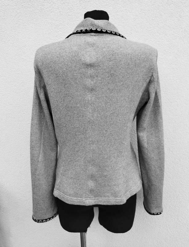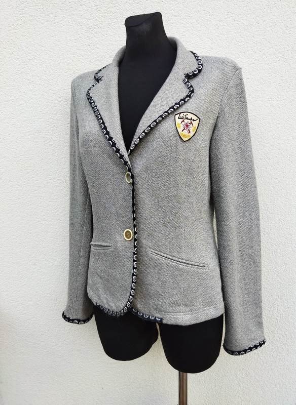 Ciekawa, zgrabna marynarka z a' dresowej bawełnianej tkaniny z domieszką w melanżowym jasnoszarym kolorze z wplecioną metaliczną nitką, obszyta granatową lamówką w białe kwiatuszki , z alpejskim akcentem w postaci aplikacji szarotki od wewnątrz i naszywki z szarotką z przodu marynarki. Z kołnierzykiem z rewersami , z dwiema wpuszczanymi kieszeniami. Zapinana na dwa guziki. Poły przodu podszyte podszewką z bawełnianej tkaniny w granatowo- białą drobną krateczkę