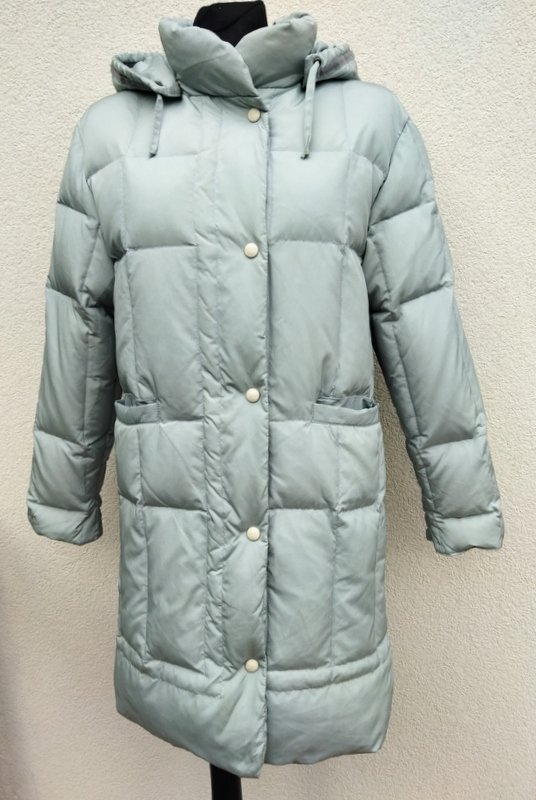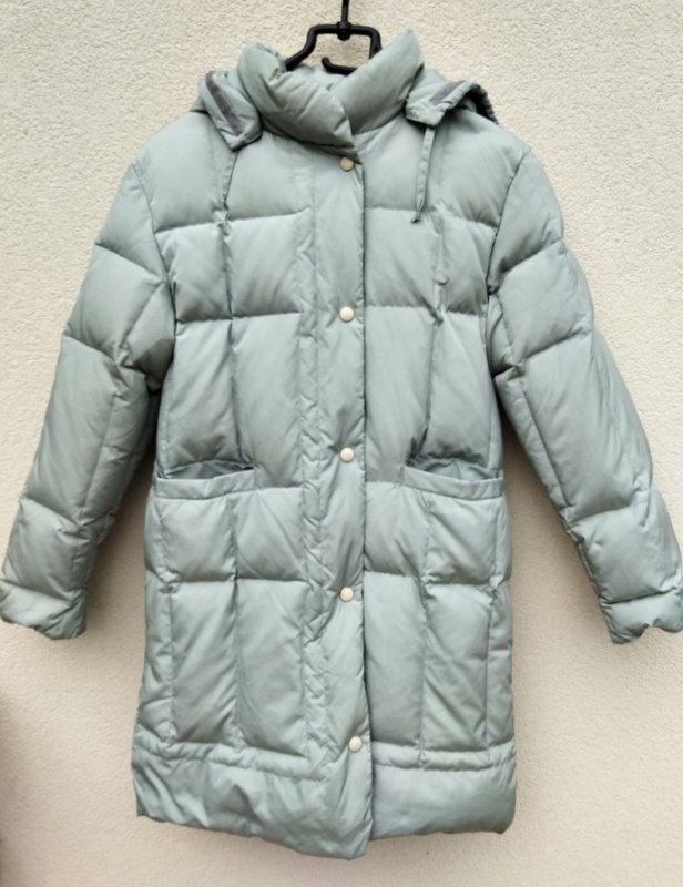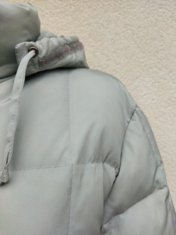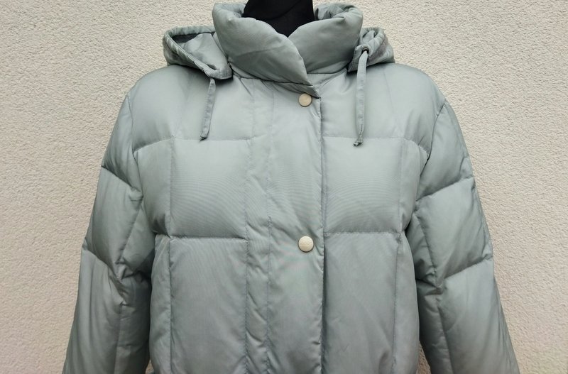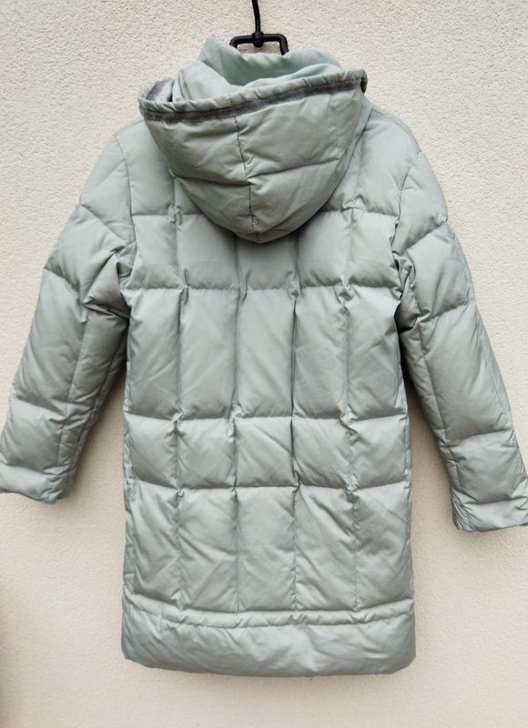 Puchowy mięciutki pikowany płaszcz z poliamidowej tkaniny w miętowym kolorze ocieplany naturalnym gęsim i kaczym puchem 90/10. Z dopinanym kapturem , z dwiema wpuszczanymi kieszeniami. Zapinany na zamek ukryty pod plisą zapinana na napy. Całość na podszewce . Ciepły i niezwykle lekki.