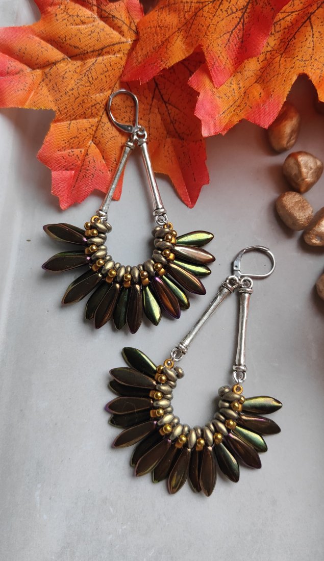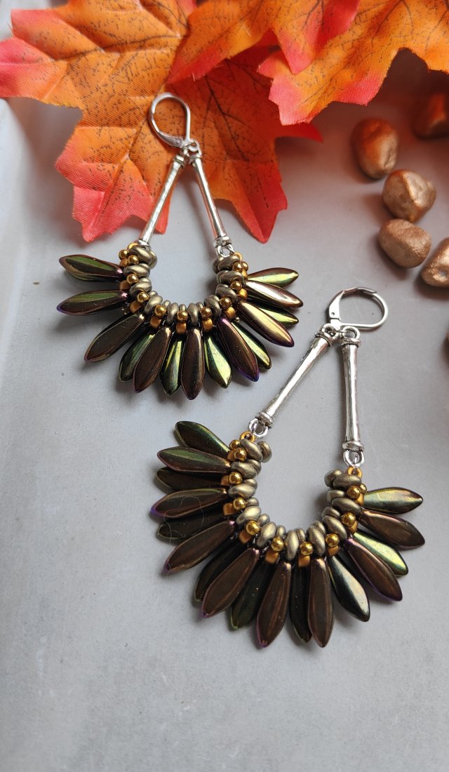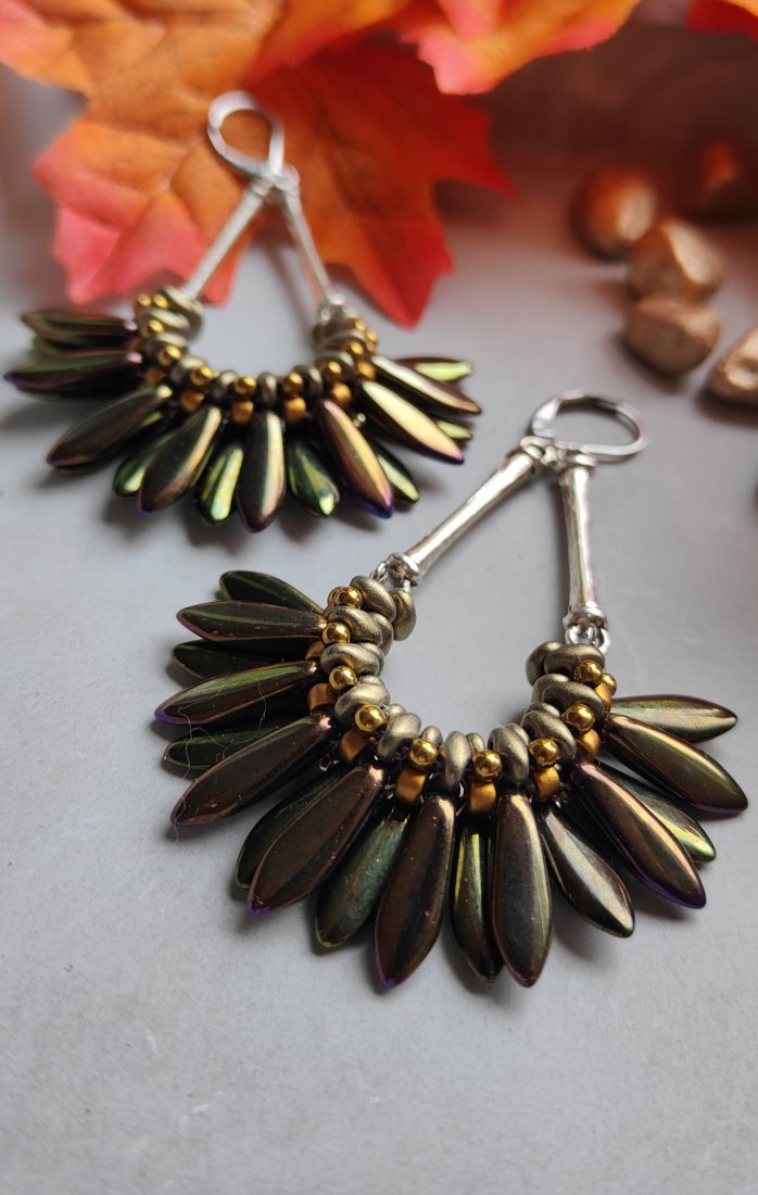 ,,łuki iris green,, to wyjątkowe i oryginalne kolczyki wykonane z koralików w odcieniu ciemnej zieleni typu ,,Iris green,, złota i czerni, z dodatkiem złotego hematytu i metalowych elementów w kolorze srebrnym.