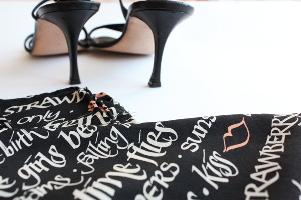 Przedstawiam Państwu wspaniałą chustę w przeróżne napisy stanowiące kwintesencję szczęścia różnej maści. Białe napisy na czarnym tle z dodatkiem jasnoróżowych akcentów. Rolowane brzegi. Tkanina jest cienka, delikatna, w dotku przypominająca jedwab. Brak metek.