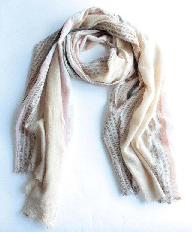 Miękki szal w pastelowe wzory luksusowej marki DAY BIRGER ET MIKKELSEN. Materiał jest cienki, delikatny w dotyku, luźno tkany, w mojej ocenie jest to kaszmir lub inny gatunek wełny (materiał jest miękki, nie gryzie).
