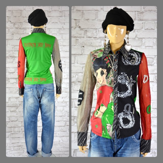 Kolorowa bluzka francuskiej marki, bluzka wykonana z trzech rodzajów tkaniny ; rękawy siateczkowe; na jednym rękawie wyszywane litery, na drugim łatka z napisami, z przodu wykonana z trzymającej formę bawełny w barwiony kreskówkowy print, z tyłu wykonana z delikatnie elastycznej, trochę jakby lejącej tkaniny w napisy. Zapinana na guziki, rękawy również.
