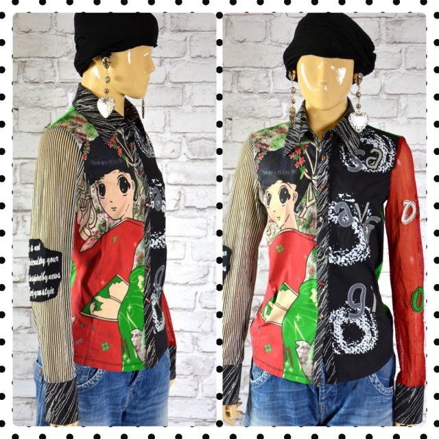 Kolorowa bluzka francuskiej marki, bluzka wykonana z trzech rodzajów tkaniny ; rękawy siateczkowe; na jednym rękawie wyszywane litery, na drugim łatka z napisami, z przodu wykonana z trzymającej formę bawełny w barwiony kreskówkowy print, z tyłu wykonana z delikatnie elastycznej, trochę jakby lejącej tkaniny w napisy. Zapinana na guziki, rękawy również.