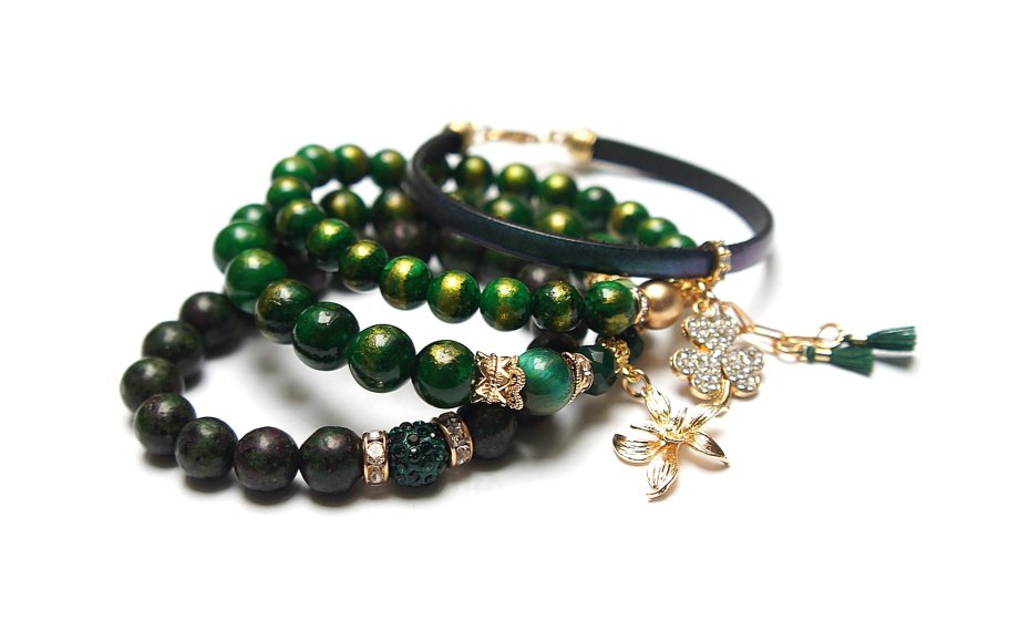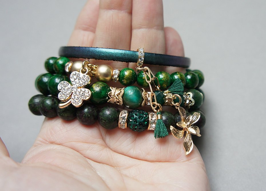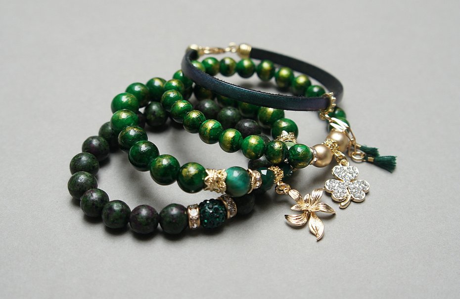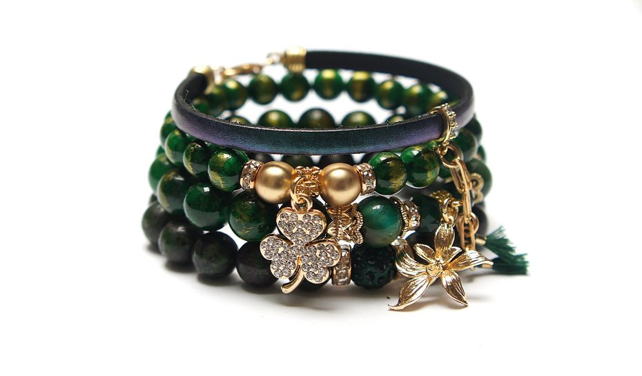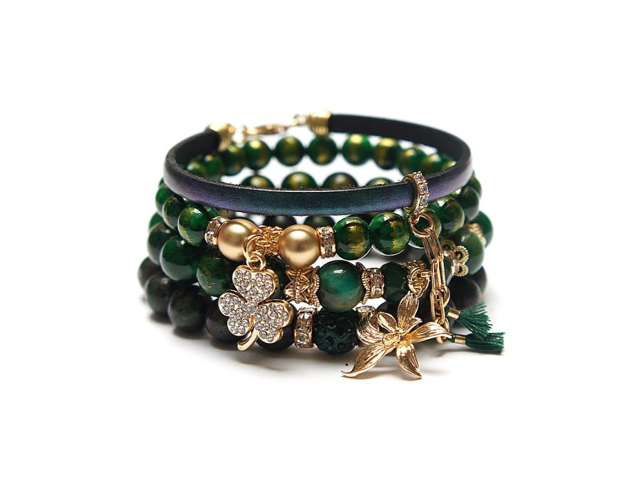 Komplet czterech bransoletek wykonanych z naturalnych kamieni - tygrysie oko [10mm], jaspis [10mm], marmur [8mm i 10mm], hematyt platerowany [8mm], rzemienia z naturalnej skóry, chwostów, zawieszki wysadzanej cyrkoniami oraz elementów metalowych w kolorze złotym. Bransoletki pasują na nadgarstek 16 - 17cm. Biżuteria ozdobnie zapakowana