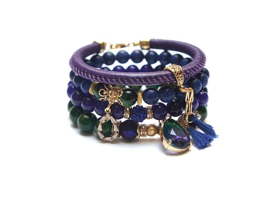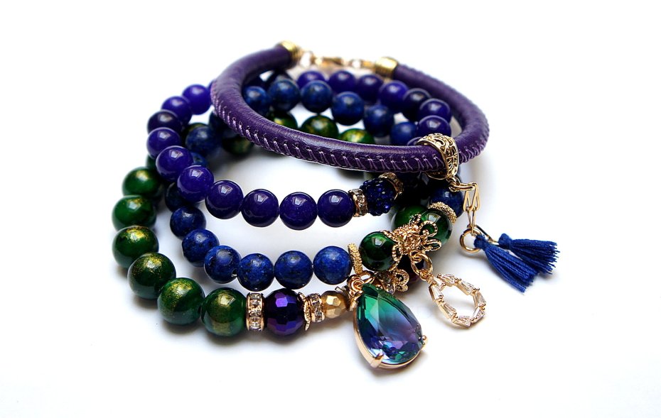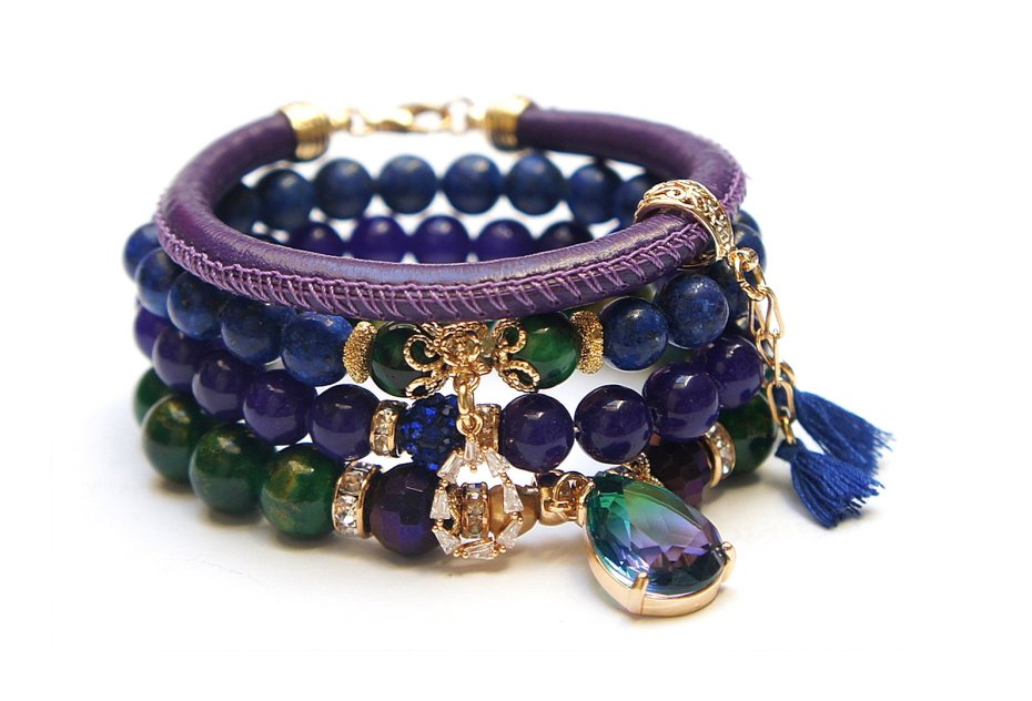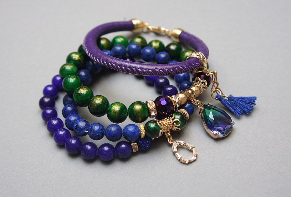 Komplet czterech bransoletek wykonanych z naturalnych kamieni: jadeity [8mm], marmur [8 i 10mm], tygrysie oko [8mm], hematyt fasetowany, platerowany [6mm], kryształki [10mm], przekładki shamballa wysadzanej kryształkami [8mm], zawieszki ze szkła w okuciu, zawieszki wysadzanej cyrkoniami, rzemienia ze skórki naturalnej, chwostów oraz elementów metalowych w kolorze złotym.