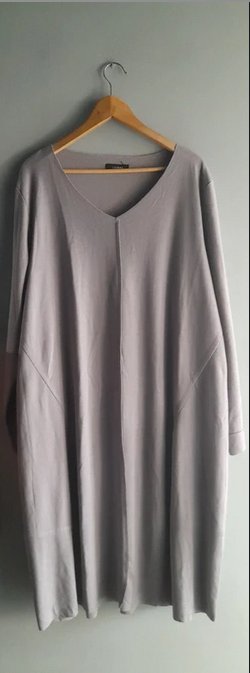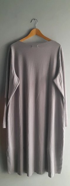Minimalistyczna sukienka z bdb gatunkowo dzianiny, surowe wykończenia, dekoracyjne, dyskretne przeszycia nadające kształt, lekko zwężana "bombkowa" na dole, rozmiar od 46, na mniejsze bardzo over, długość 120,pod pachami 68x2 bez naciągania, niszowa marka z gurnej półki stan idealny