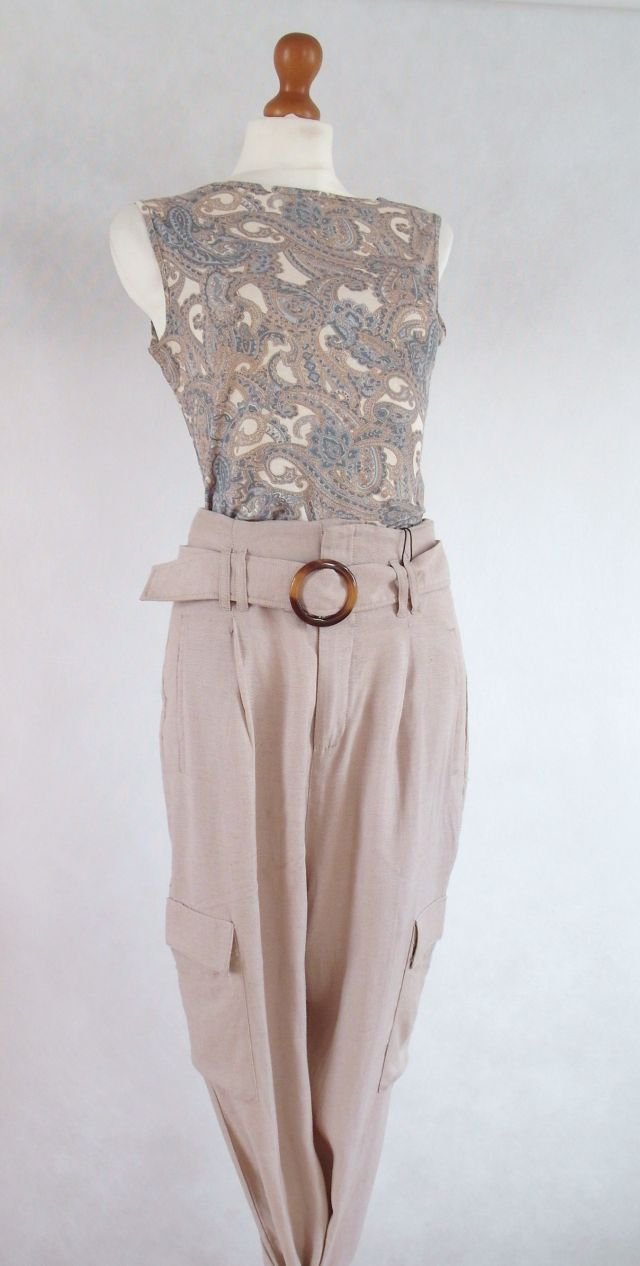 Kolor beż, duże boczne kieszenie, pasek.świetne do trampek.