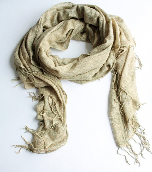 Miękki, luźno tkany szal o niejednolitej strukturze i kolorze. Dominuje beż z kroplą zieleni.