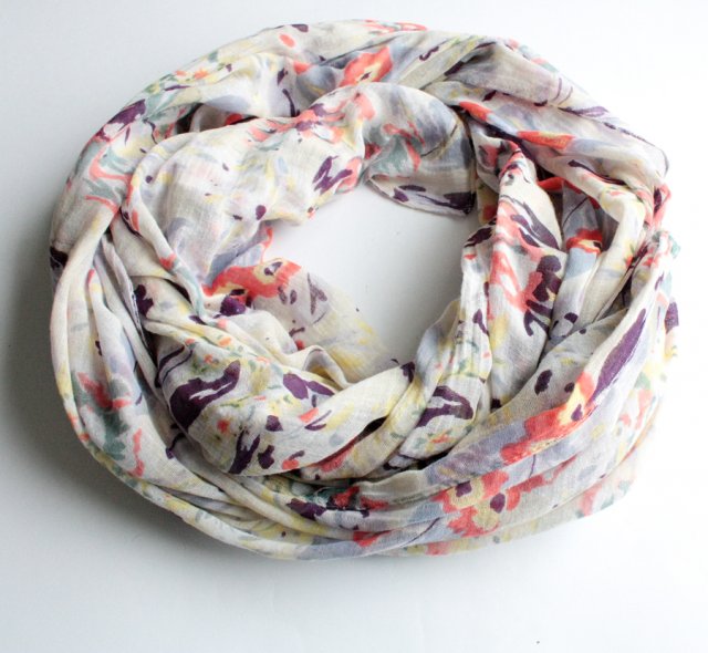 Duży, luźno tkany szal w wielobarwne wzory. Materiał to prawdopodobnie bawełna.