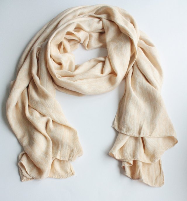 Duży, miękki, luźno tkany szal beżowo-kremowe wzory. Materiał to prawdopodobnie bawełna lub wiskoza.