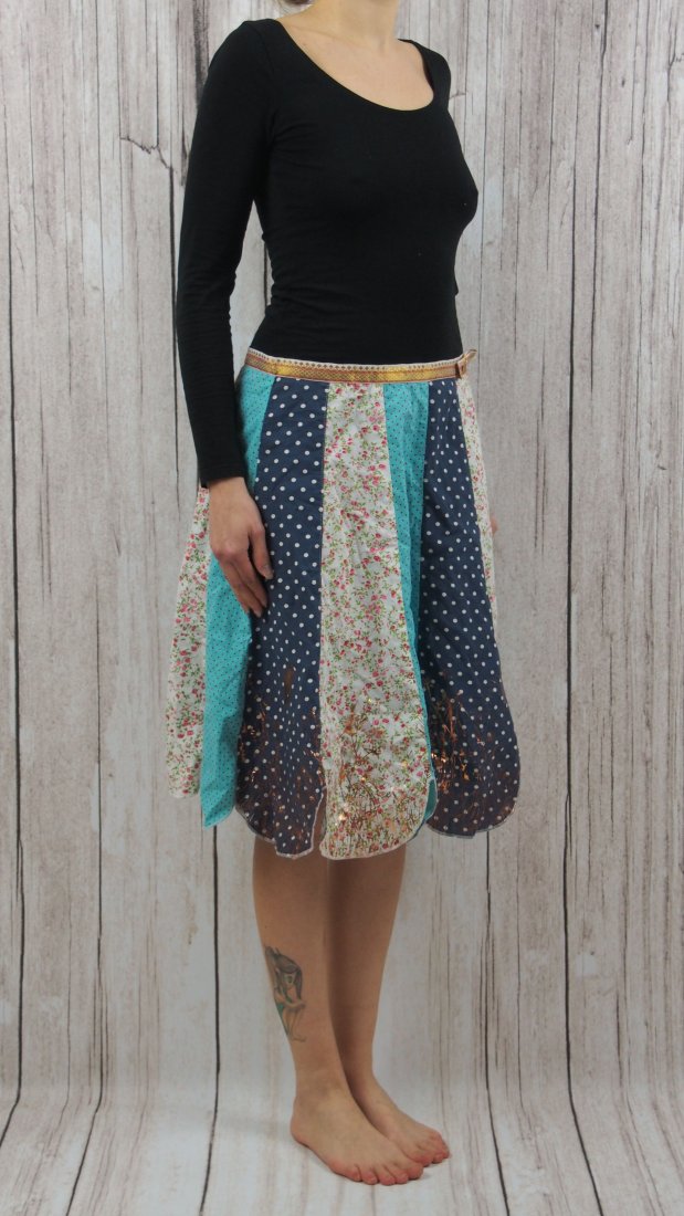 Śliczna designerska spódnica marki LYSGAARD. Bawełniana. Letnia i urocza. Patchwork z podłużnych zaokrąglonych na końcach elementów. Wygląda jak kwiatek.