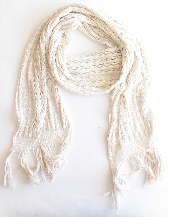 Miękki duży szal skandynawskiej marki Lysgaard w kolorze złamanej bieli. Wykonany prawdopodobnie ręcznie na szydełku z bawełny.