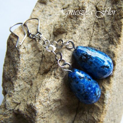 Długie kolczyki wykonane z fasetowanych kropel awenturynu (22mm/12mm) powieszonych na karbowanym łańcuszku. Srebro pr.925. Całość oksydowana i wypolerowana na mat.