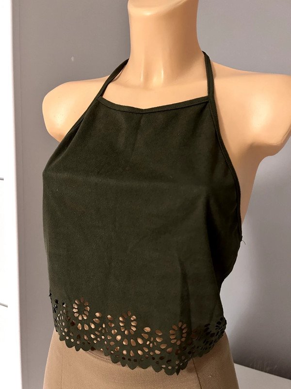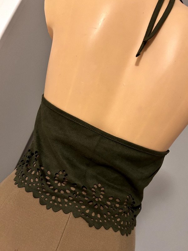 Top bluzka Shein wiązany na szyi, r. M, materiał a'la skóra welurowa, ciemnozielony, na dole wycięte, wyciskane dziurki ażurowe