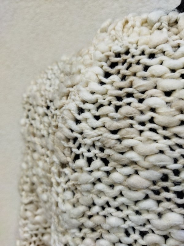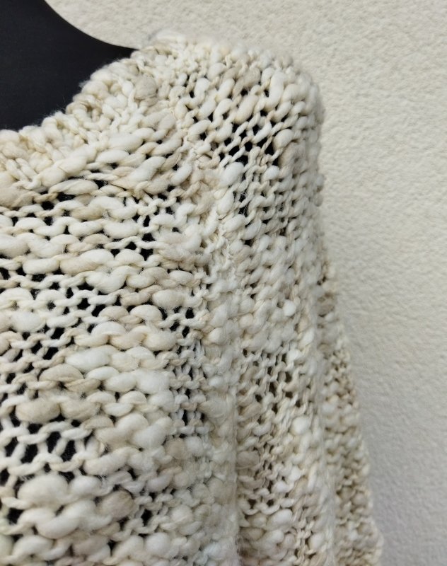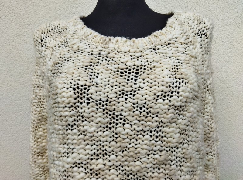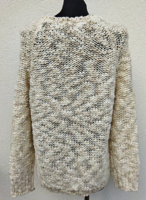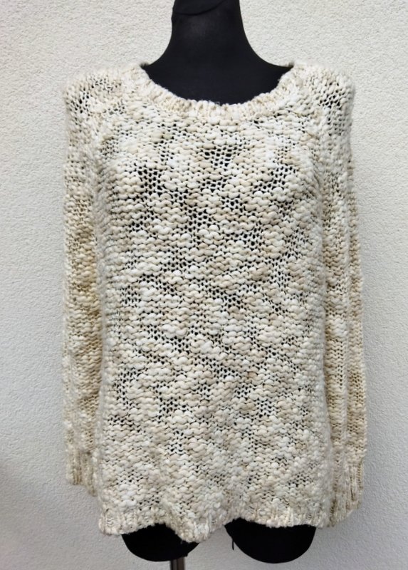 Sweter z akrylowej włóczki z faktura boucle o luźnym nieregularnym splocie , w kolorze mlecznej bieli i ziemistego bezui. owalny dekolt raglanowe rękawy. Wykończony ściągaczami.