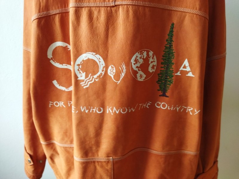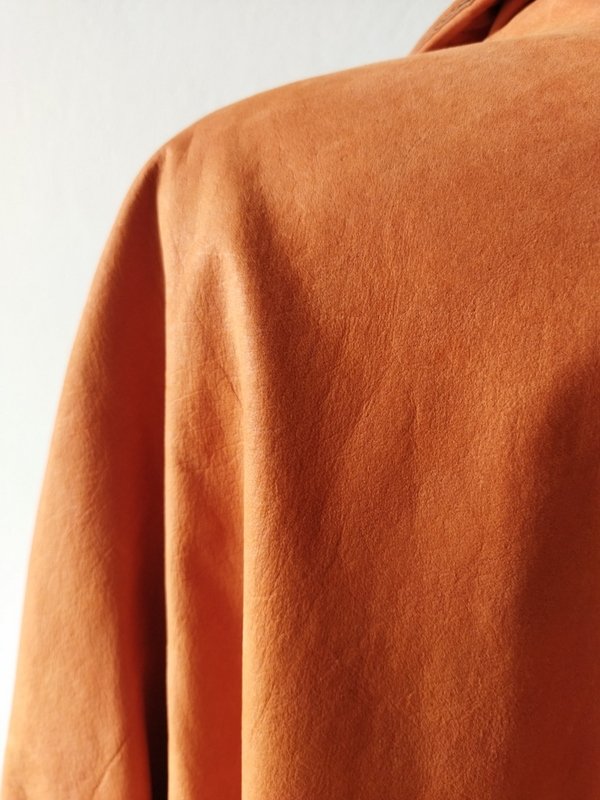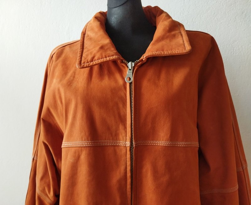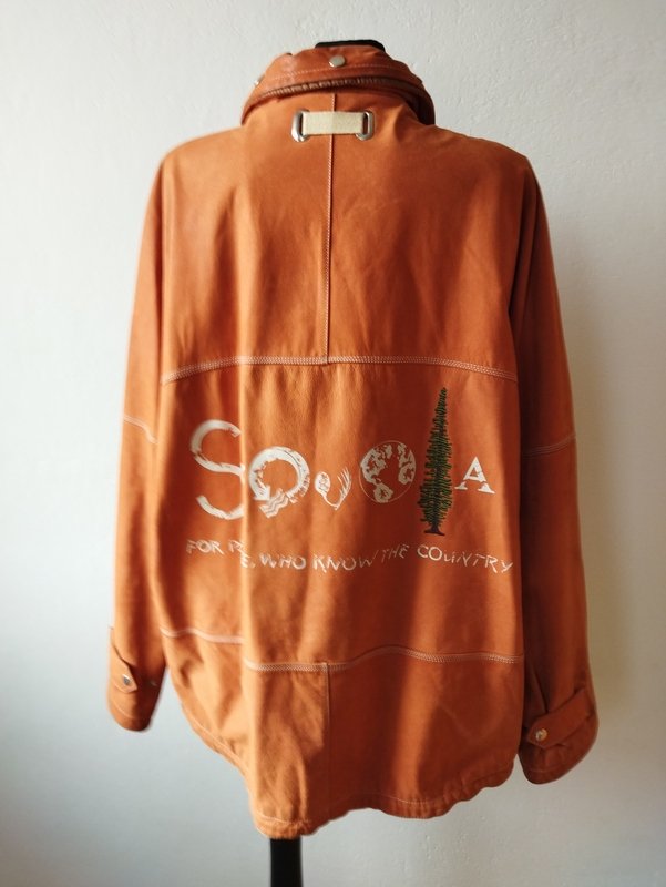 Kurtka z naturalnej skóry nubukowej w rudym kolorze stebnowana jasną nicią. Starannie uszyta z licznymi detalami. Z kołnierzem z ukrytym w nim kapturem, z dwiema wpuszczanymi kieszeniami, z patkami na mankietach rękawów, ściągana u dołu sznurkiem ze stoperami. Tył zdobiony haftem napisem i malunkami. ZApinana na zamek. Całość na podszewce .