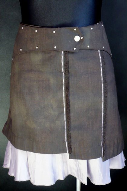 Oryginalnie uszyta i zaprojektowana duńska spódnica.Ciekawie połączone tkaniny. Malutkie ćwieki+haft+wystrzępienia+delikatny nadruk na tkaninie. Wystająca podszewka.Asymetryczna. Zamek z przodu.Ciemny brąz+podszewka-lila.