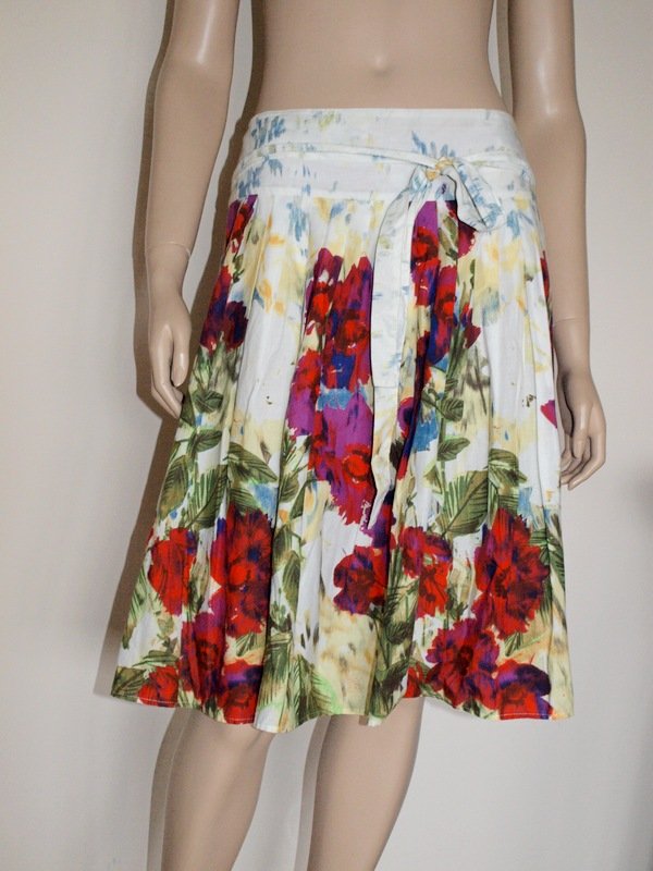 letnia spódnica marki Marks&Spencer. Materiał prawdopodobnie drukowana bawełna. materiał, cienki, zamek z boku. od karczku układana w zakładki, dodatkowo cienka wiązanka. brak metki z rozmiarem, myślę, że ok 42. Podaję wymiary mierzone na płasko;