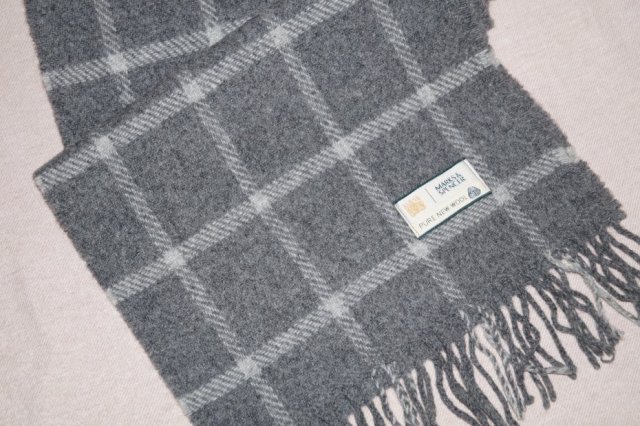 Wełniany szal w kratę marki Mark & Spencer, , 100% wełna merynosów, delikatny motyw kraty, na szarym tle popielata krata, klasycznie elegancki, brzegi wykończone frędzelkami