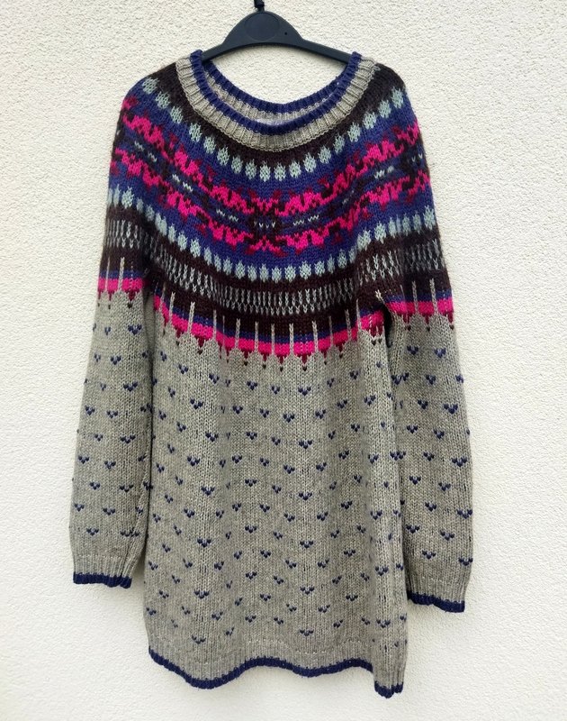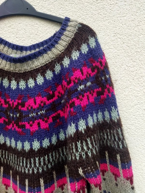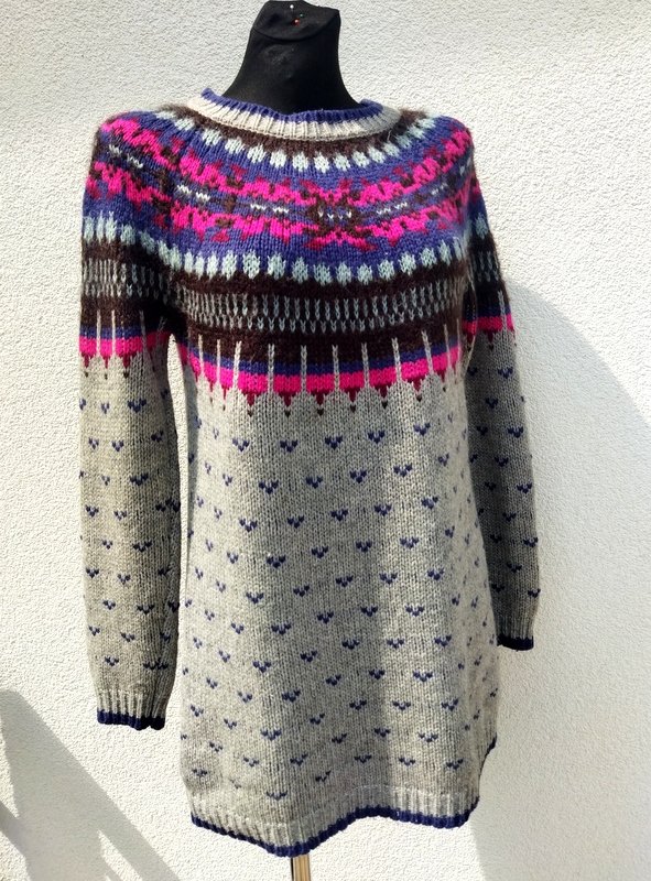 Wzorzysty sweter w kolorze jasnej szarości z wzorami w kolorach czerni, kobaltu, mięty, burgundu i mocnego różu. Z okrągłym karczkiem., z raglanowymi rękawami. Wykończony ściągaczami.