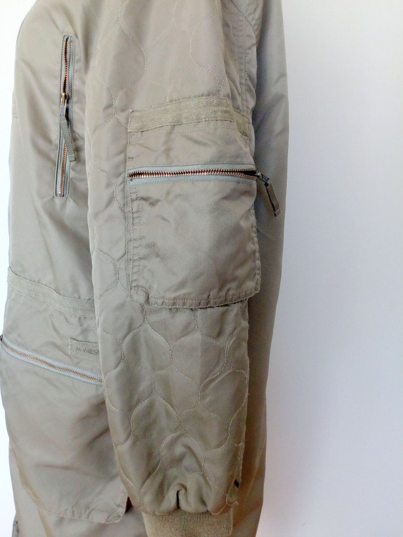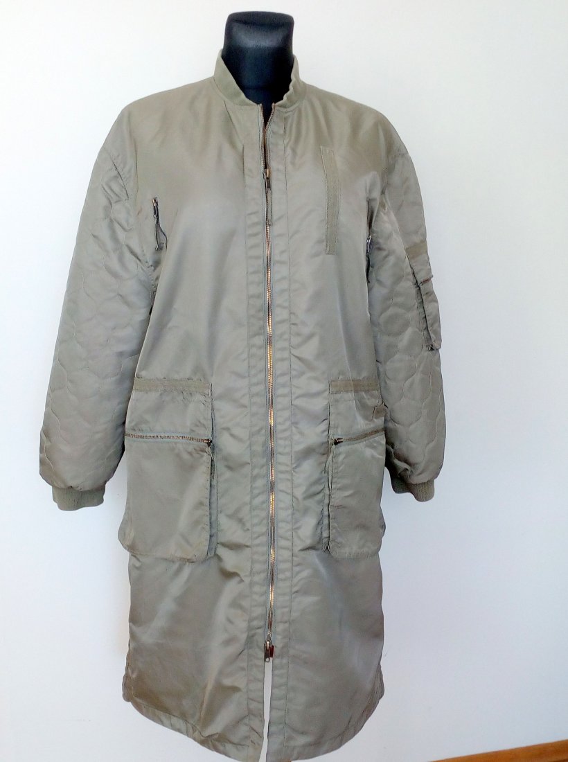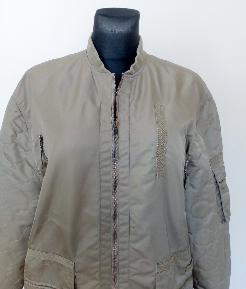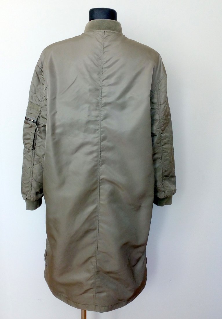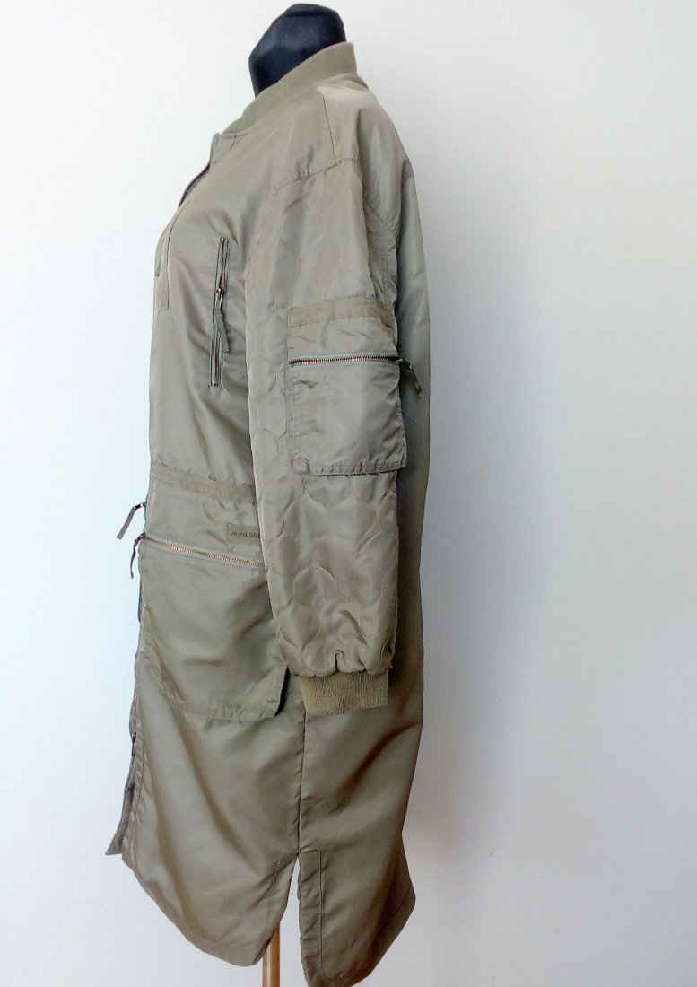 Lekko ocieplany płaszcz w kolorze zielonym/ khaki, zapinany na zamek w złotym kolorze, na piersiach naszyte rozpinane zamki imitujące kieszenie, u dołu przodu naszyte duże kieszenie zapinane na zamek, mała kieszeń naszyta na lewym rękawie - również z zamkiem, rękawy ozdobnie pikowane z dzianinowym ściągaczem u dołu, wokół szyi dzianinowa stójka, płaszcz po bokach rozcinany i zaokrąglony, przód płaszcza nieco krótszy niż tył, od środka podszewka w kolorze pudrowego różu z logo firmy pośrodku pleców