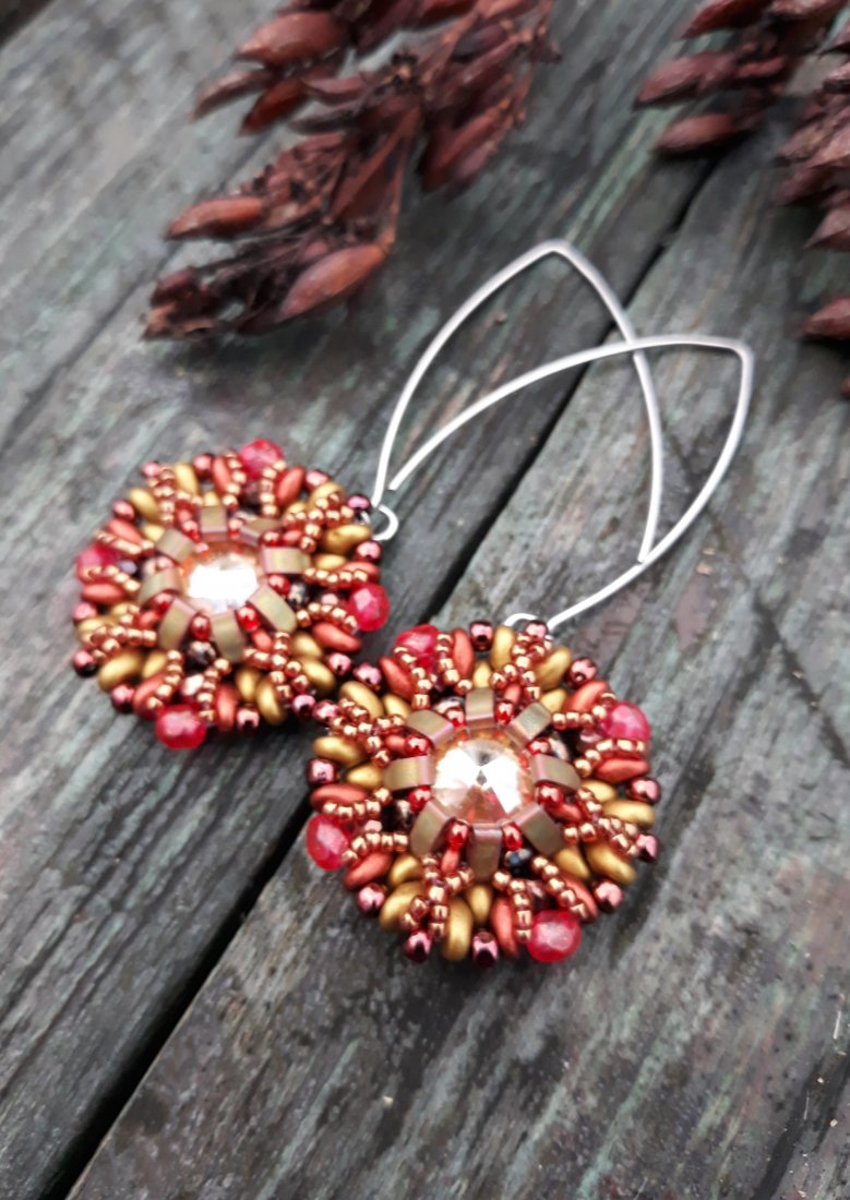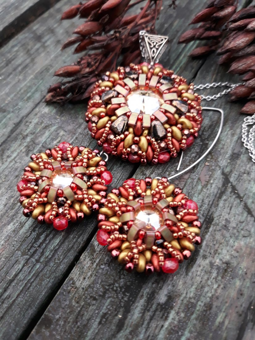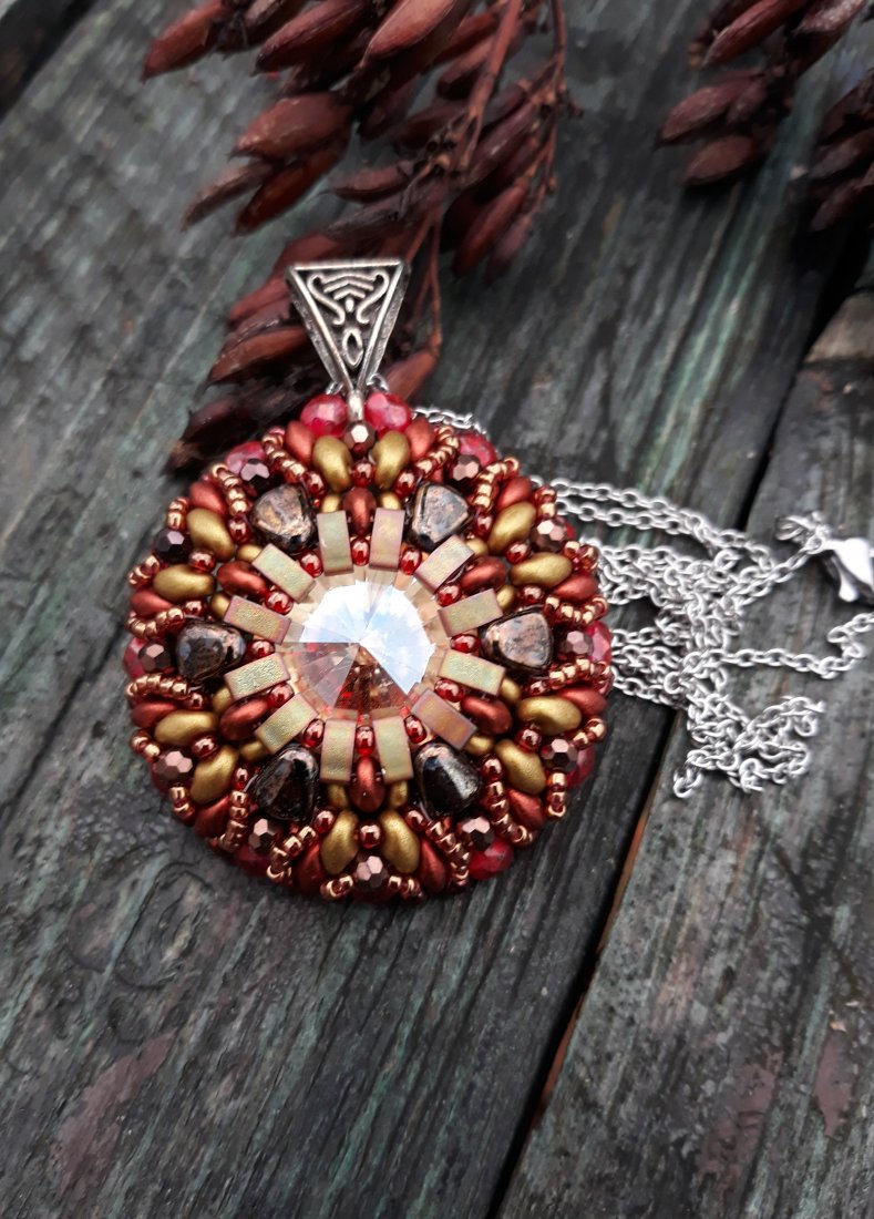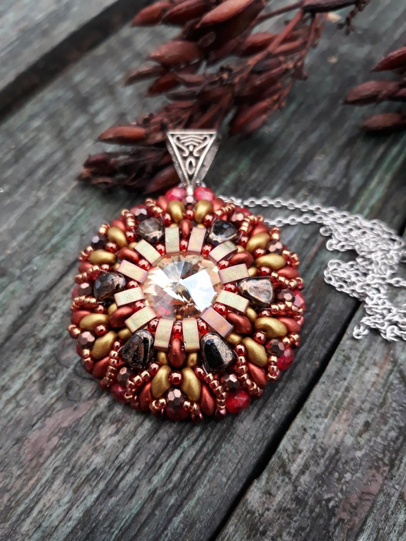,,medalion w złocie i brązie,, to krótki ażurowy wisior wykonany ze szklanej rivoli oplecionej koralikami i kryształkami w różnych odcieniach złota, brązu i czerwieni. Wisior zawieszony jest na drobnym,ozdobnym łańcuszku wykonanym ze stali szlachetnej.