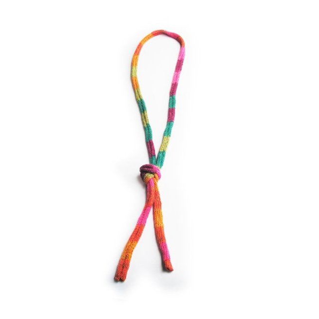 Naszyjnik - Tęczowy Supeł. Kolorowy naszyjnik wykonany w całości na drutach z cieniowanej, cieniutkiej włóczki - 100% bawełna. Całość ma długość ca 1,50 m i pozwala na wiele sposobów noszenia - z supłem lub bez, na szyi jako szaliczek lub naszyjnik lub na ramieniu jako bransoleta.