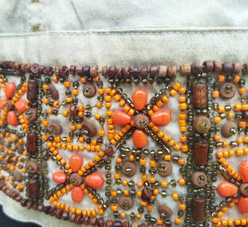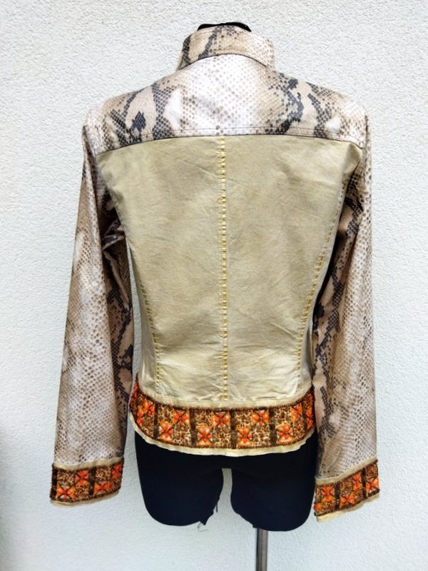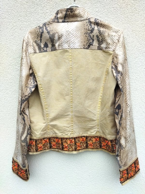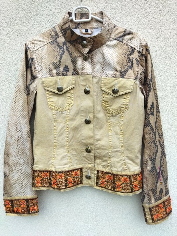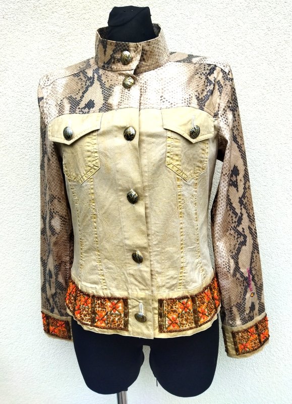 Ciekawa  efektowna kurtka  z łączonych tkanin; bawełnianej ze metalicznym złocistym połyskiem  i bawełnianej jakby lakierowanej w wężowy wzór w  odcieniach beżu i brązu . Z przepięknymi  misternymi zdobieniami  z naszywanych koralików  na mankietach rękawów i u dołu kurtki. Taliowana, z dwiema naszywanymi kieszeniami z patkami na guzik. Zapinana na metalowe guziki z wężowym wzorem. Bez podszewki. Cudna,  w realu ładniejsza.