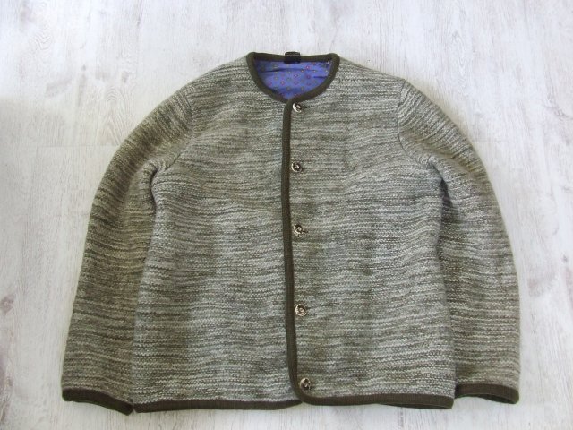 Oryginalna tyrolska, austriacka wełniana kurtka/sweter w kolorze oliwkowym. Posiada niebieską bawełnianą podszewkę w kolorowe kwiatki oraz kieszonkę wewnątrz. Zapinana na ozdobne guziki imitujące drewno.