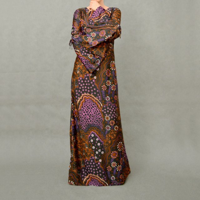Sukienka vintage w kwiaty. W jesiennych kolorach, długość maxi. Prosta z ciekawymi, szerokimi rękawami.