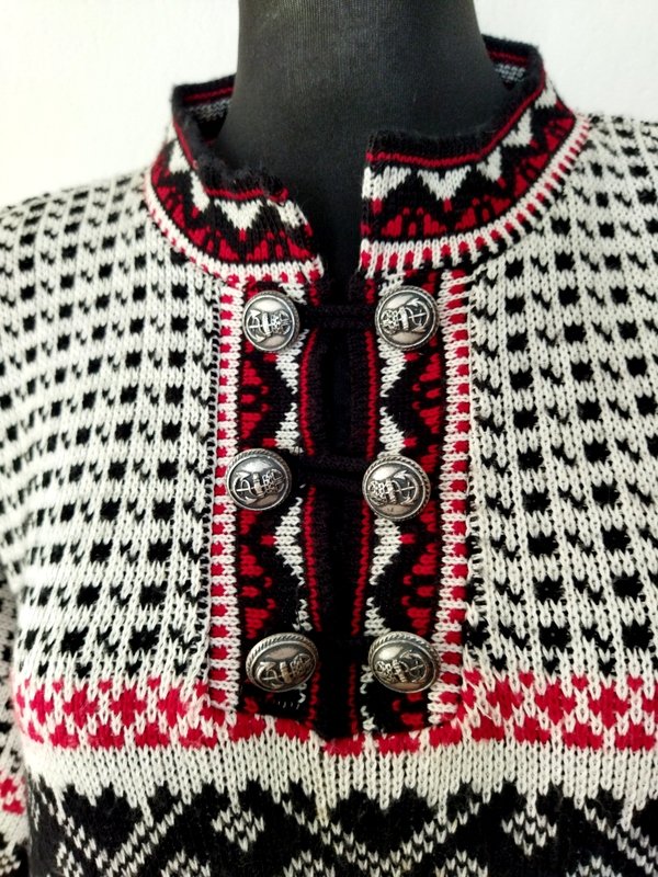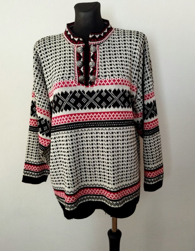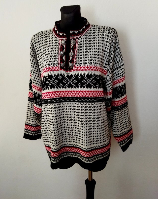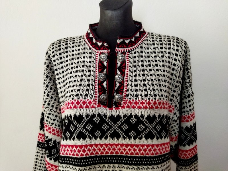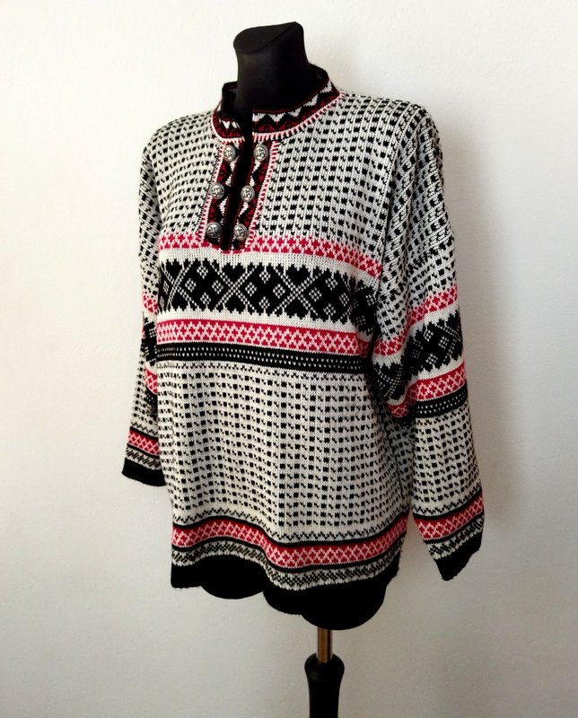 Wzorzysty sweter z bawełniano-akrylowej włóczki w klasycznej kolorystyce bieli czerni i czerwieni. Luźny oversizowy fason z ozdobnym zapięciem u góry na grawerowane metalowe guziki w kolorze starego srebra łączone dzianinowymi pętelkami. Wykończony wąskimi ściągaczami