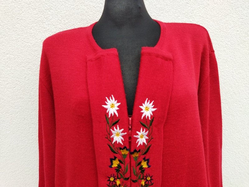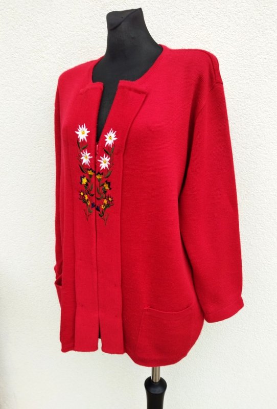 Elegancki dobrej jakości sweter z dużym udziałem wełny w kolorze nasyconej czerwieni. bez kołnierza z dwiema naszywanym kieszeniami. Zapinany na zamek ukryty pod plisami zdobionymi kolorowym haftem kwiatowym.