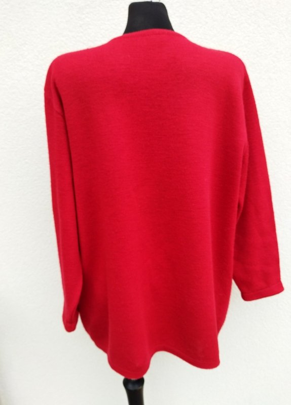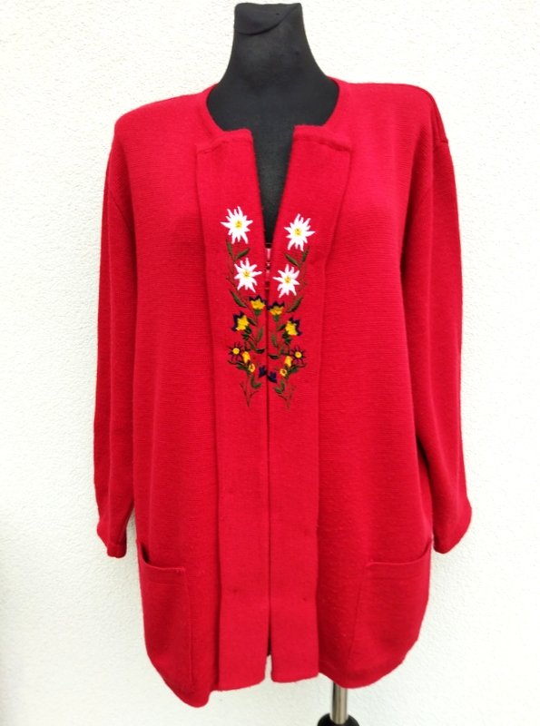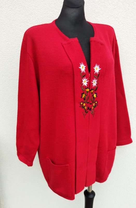 Elegancki dobrej jakości sweter z dużym udziałem wełny w kolorze nasyconej czerwieni. bez kołnierza z dwiema naszywanym kieszeniami. Zapinany na zamek ukryty pod plisami zdobionymi kolorowym haftem kwiatowym.