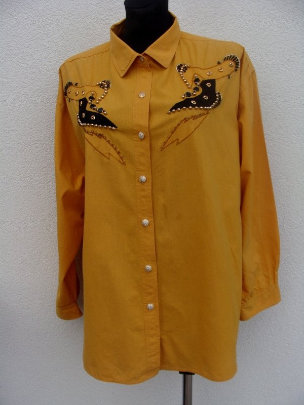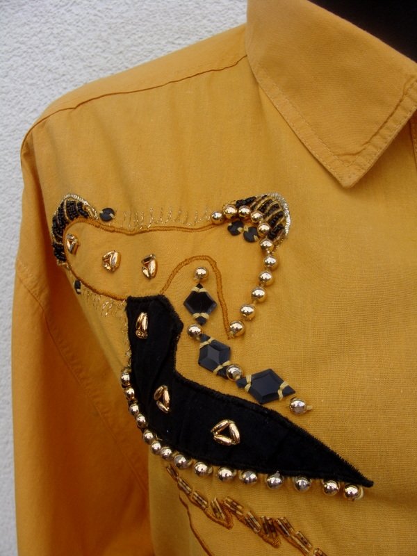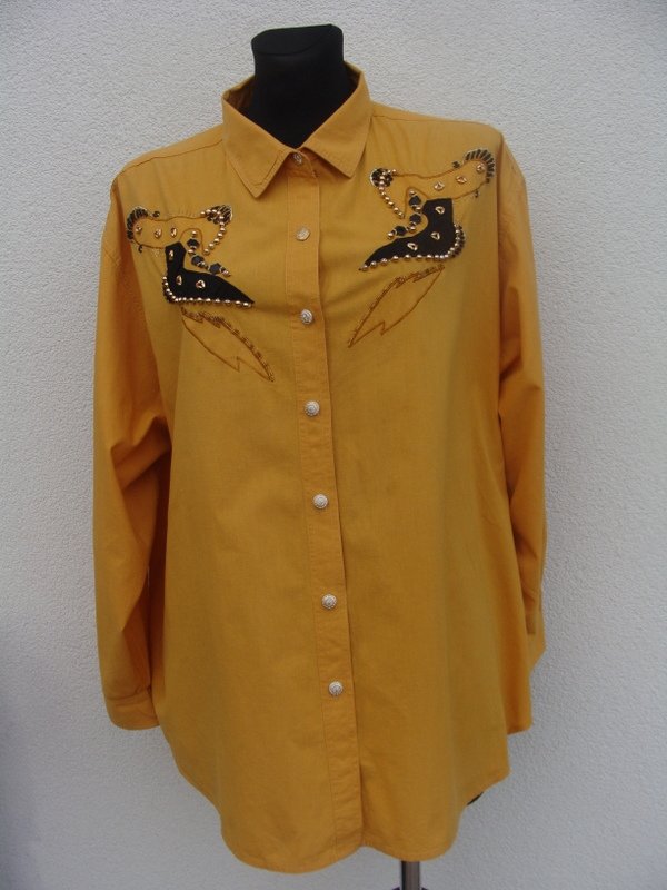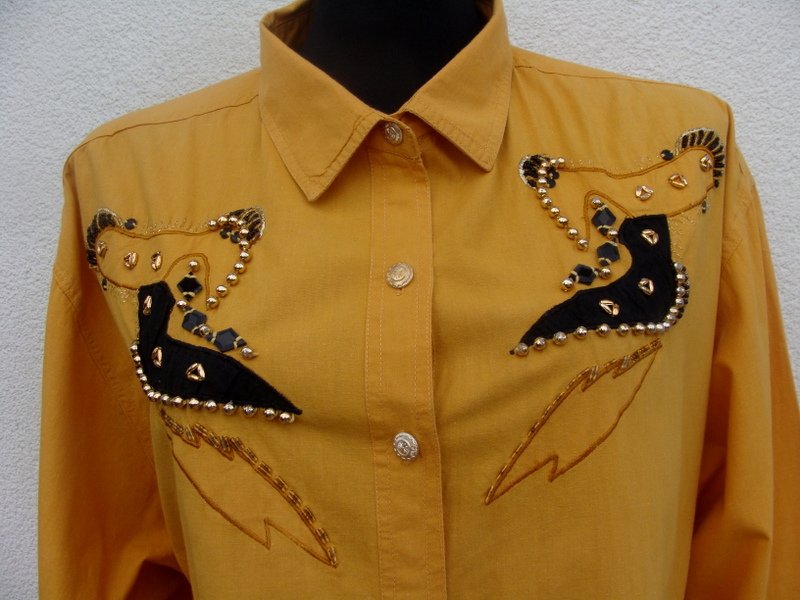Koszulowa bluzka z bawełnianej tkaniny w kolorze słonecznikowej żółci ze zdobieniami z przodu ( aplikacje i koraliki ). Z kołnierzykiem z karczkiem z tyłu. Zapinana na grawerowane guziki w srebrnym kolorze.